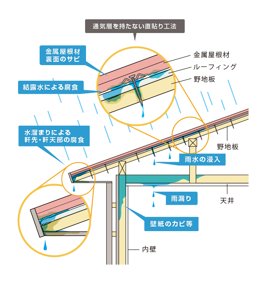 しかし、金属屋根材における従来の施工法である「直貼り工法」は、屋根裏に空気の通り道がないため雨水や結露水を外部に逃がすことができません。長期間にわたり水分が滞留するため、金属屋根材の裏面が劣化・腐食したり、固定金具を設置した部位(釘・ビス穴)から水分が浸蝕したりすることで、野地板、柱(構造材)への浸水、家屋内の雨漏りに発展する要因として問題が指摘されています。屋根裏面に通気層を持たない構造では住宅の完成時から腐食が始まり、早ければ10年以内に雨漏りの症状が出るケースも少なくありません。
