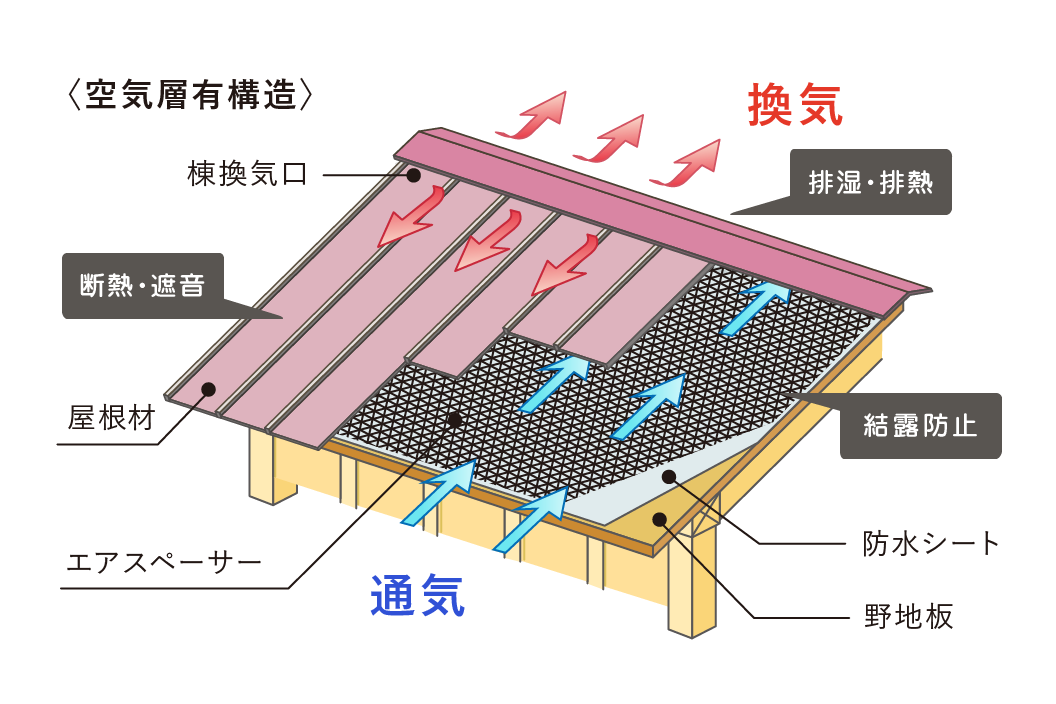 屋根材の施工において、とても重要になるのが『気密性の確保』と『通気性の確保』です。気密性とは空気を閉じ込めておくことであり、通気性とは空気を外へ流すことです。