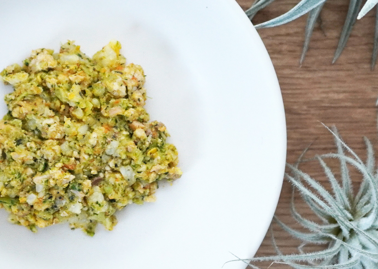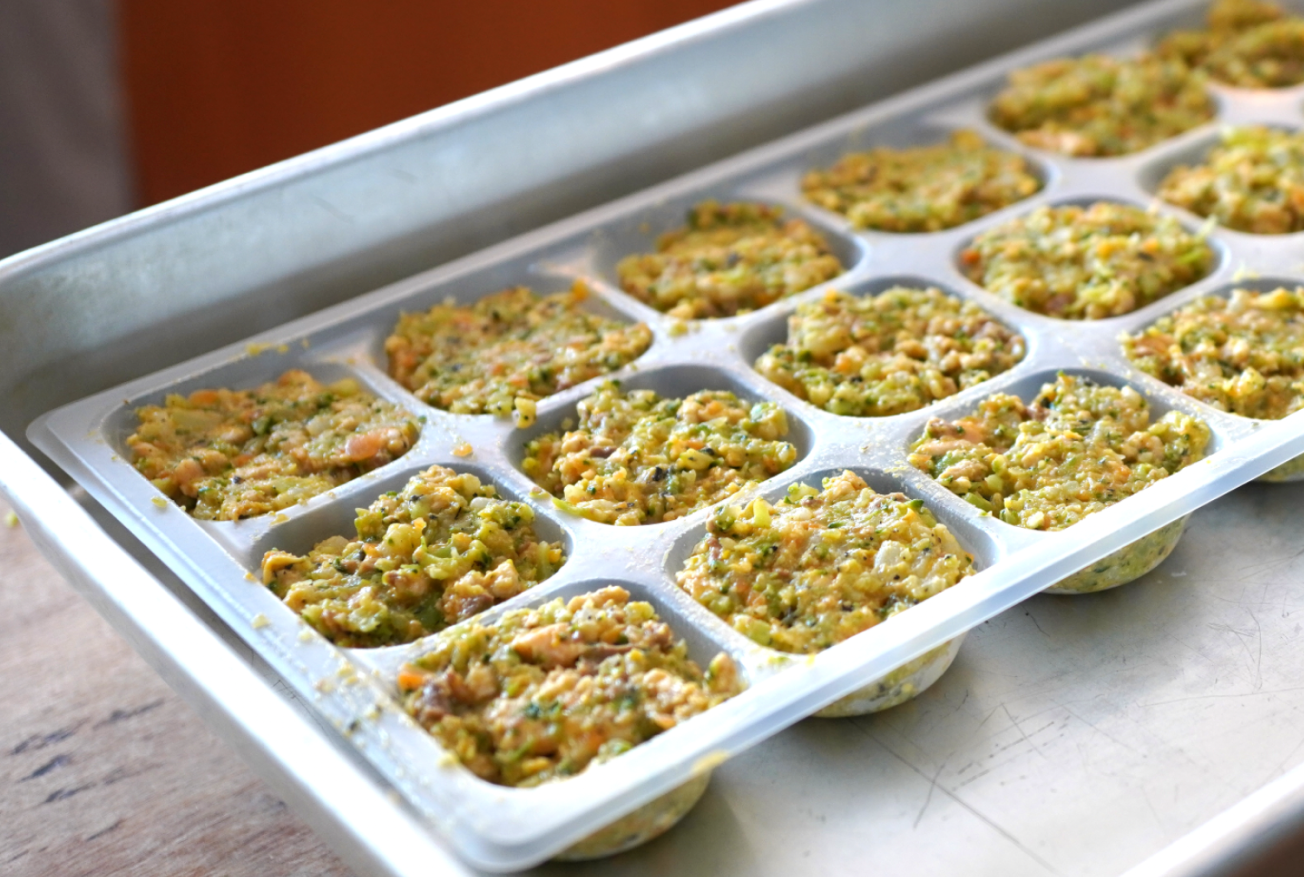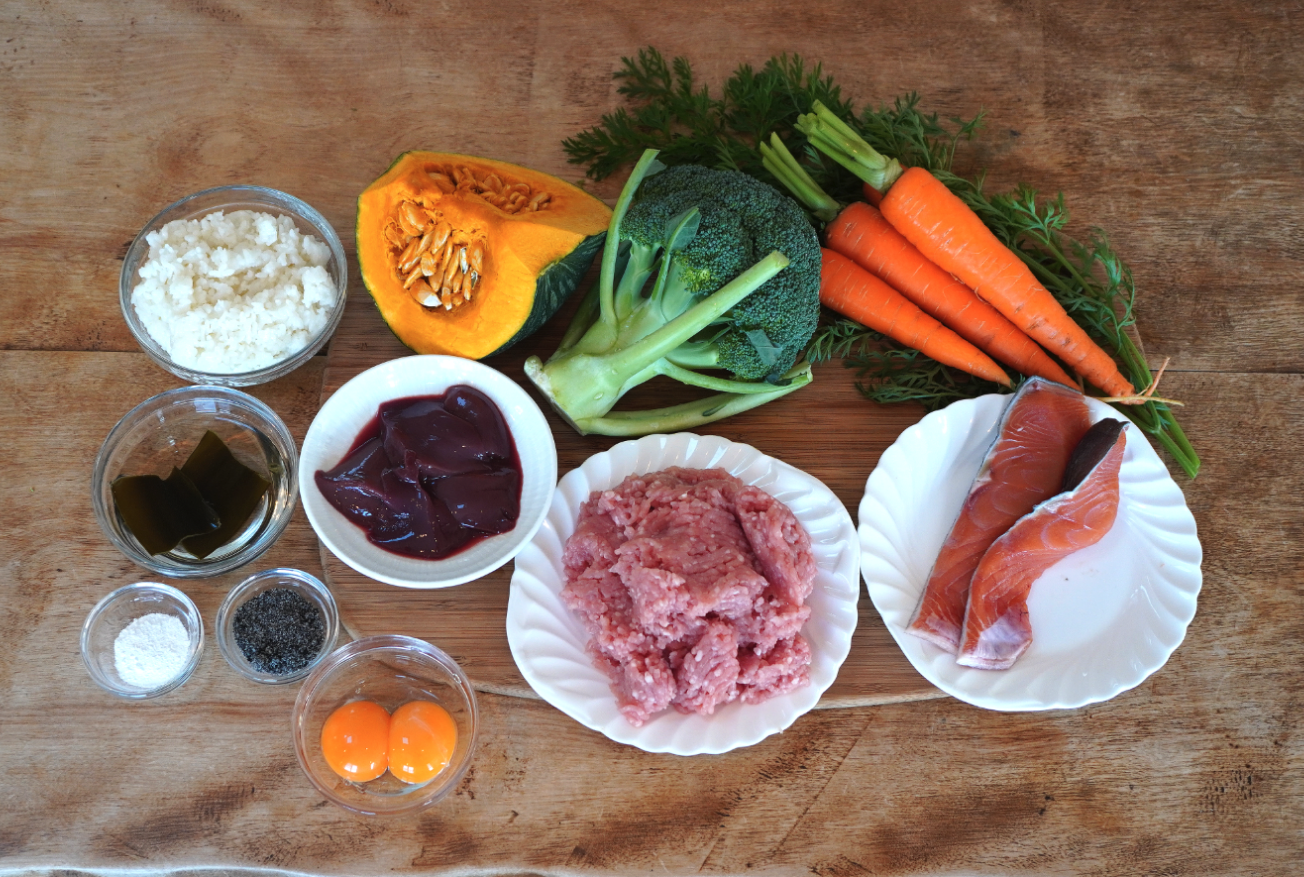 豚肉、ブロッコリー、豚レバー、かぼちゃ、にんじん、鮭、米(炊飯)、卵黄、黒ごま、昆布だし、卵殻カルシウム