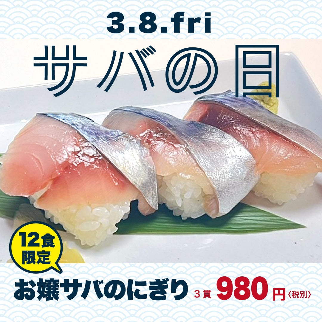 完全陸上養殖のお嬢サバのにぎり寿司3貫盛り合わせ(980円(税別))が3月8日、サバの日当日限り、12食限定で登場します。また、3月8日がお誕生日のお客様は最高にお得に!! 人気メニューの380円均一も行います。ぜひ、サバの日にサバを食べて、サバ業界、水産業界を盛り上げましょう!!