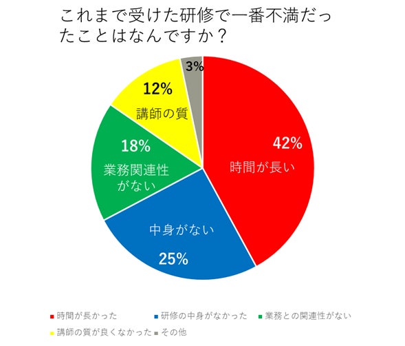 続く2位は「研修の中身がなかった」、3位は「業務との関連性がなかった」と、研修内容と仕事への関連性や、仕事への活用可否のからくる不満が43%を占めました。
