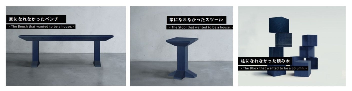 湾曲した根元や主材料の端材などを丁寧に繋ぎ合わせ、藍染めを施し、素材全体の表情を統一することで、本来利用価値の低い良質な無垢材を有効活用し、新たな木材の市場価値と巡回を生み出すサステナブルな家具づくりを目指している。