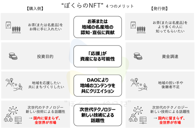 しかし、いしい茶園のみでは完全に⼒不⾜です。そこで、今回はブロックチェーン技術を活⽤したNFT(Non-Fungible Token)によって、地域課題の解決に取り組みたいと考えました。