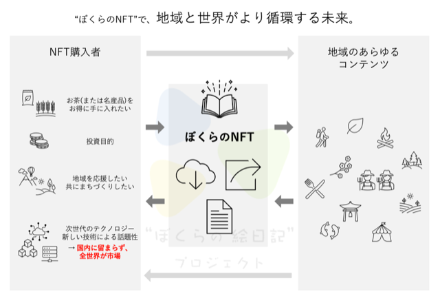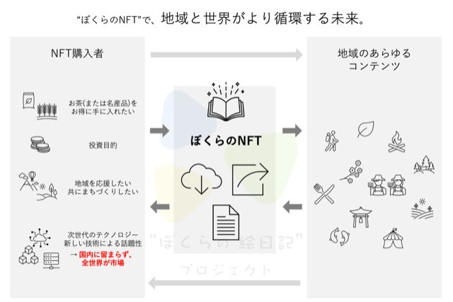 “ぼくらのNFT”は、今の景色や文化をNFTに残しつつ、新たな仲間と新たな景色を付け加えることができる取り組みです。そして、共創モデル“ぼくらの絵日記”プロジェクトによって、“ぼくらのNFT” の所有者たちと“YADORIKI-DAO”を立ち上げ、地域発の新たな循環型エコノミーに挑戦します。