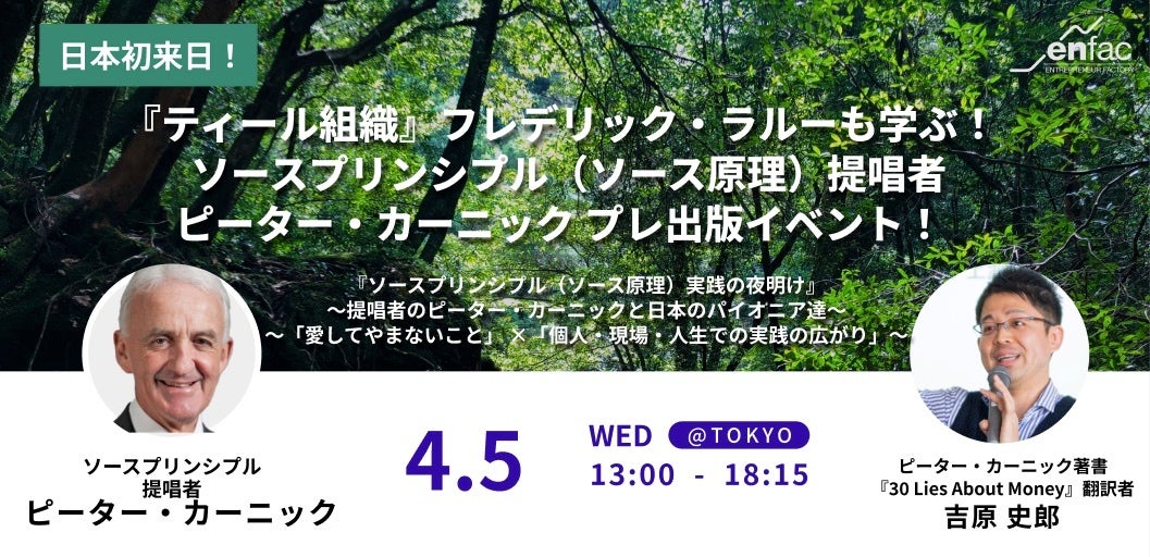 『ティール組織』の日本での発売から約5年。コロナ禍を経て、「組織」の捉え方が「機械から生命へ」と変化する転換点に差し掛かっています。『ティール組織』の原書要約、『実務でつかむ!ティール組織』の出版を始めとし、最先端の経営の研究を行うNatural Organizations Lab株式会社(以下、NOL)では、組織の全く新しい見方を提示し、話題となっている「ソースプリンシプル(ソース原理)」の提唱者:ピーター氏の公認プラクティショナーとして、ピーター氏を4月にお招きし、株式会社アントレプレナーファクトリー様ご主催の元、JUNKANグローバル探究コミュニティと共に、イベント開催を致します。
