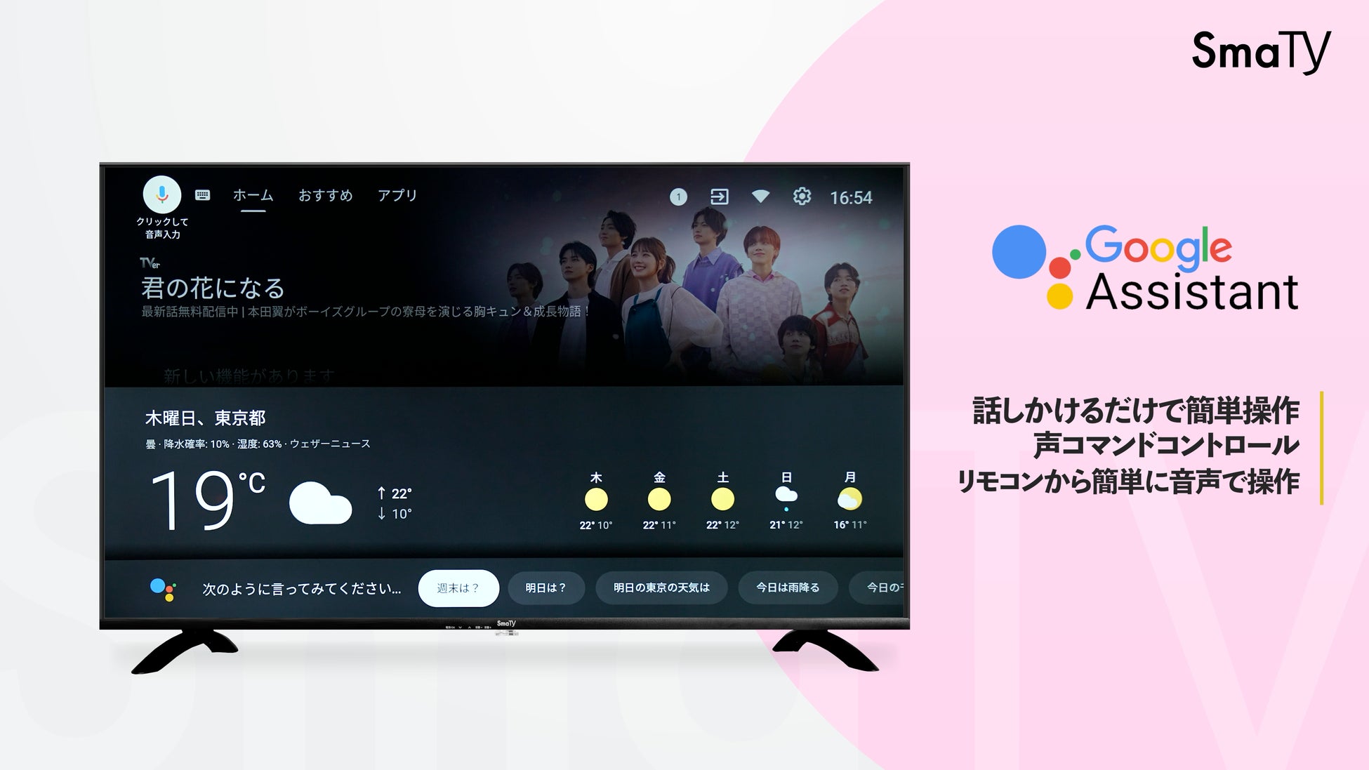 Googleスピーカーに対応するGoogleアシスタントボタンがリモコンに搭載しており、TVに向かって話しかけるだけで簡単に操作できます。