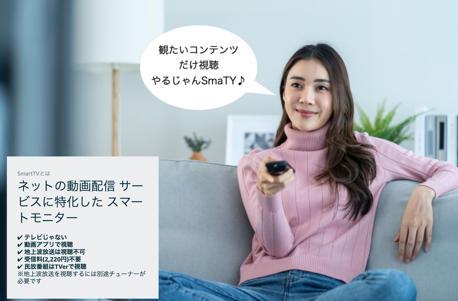 受信料契約(支払う必要)の必要のないテレビ、4K解像度に対応した43V型 チューナーレス スマートテレビを期間限定3万4900円で発売。スマホもPCもTVに映す次世代型テレビが大人気!