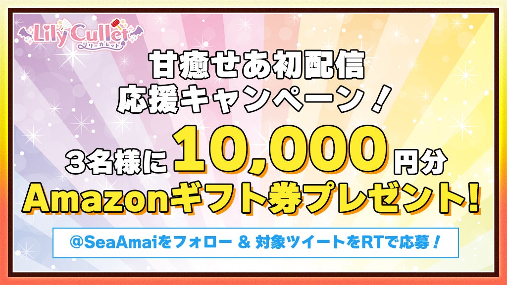 甘癒せあTwitterアカウント(@SeaAmai)をフォロー後、対象のツイートをリツイートした方の中から、抽選で3名様に1万円分のAmazonギフト券をプレゼントいたします。