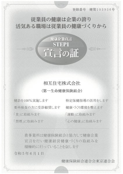 相互住宅株式会社 健康企業宣言「宣言の証」取得について