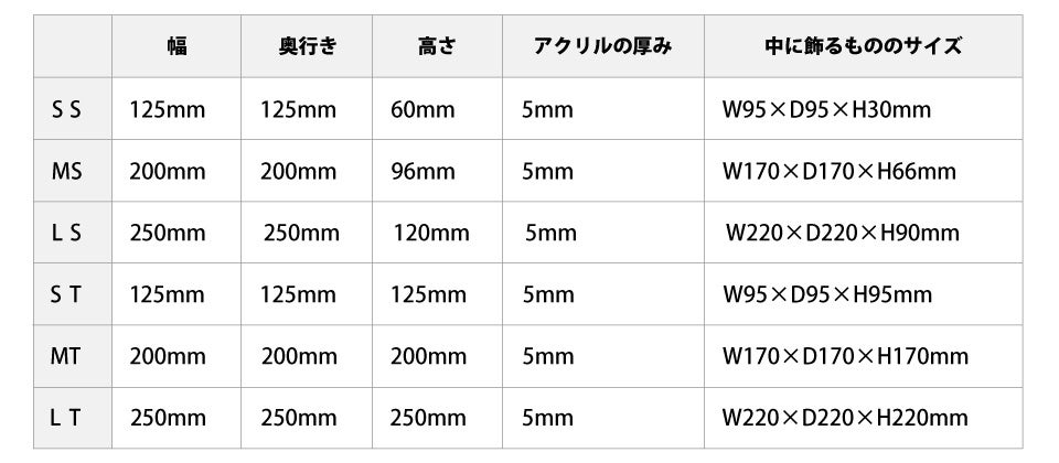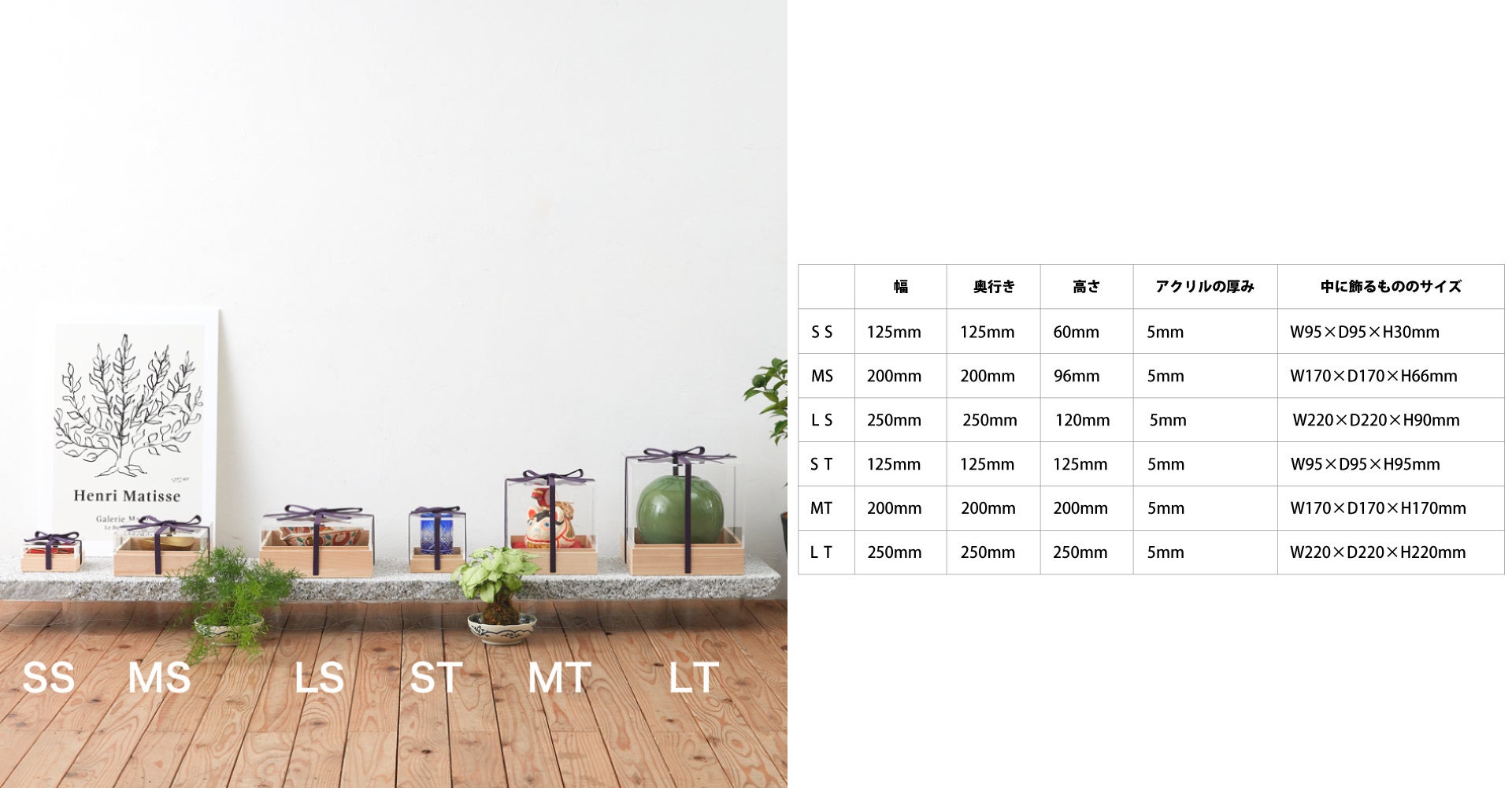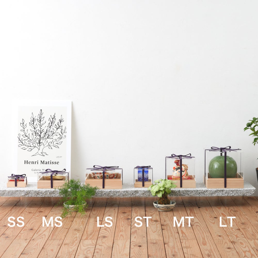 中に入れるもののサイズや高さなどに合わせてお選びいただける、6種類(SS、MS、LS、ST、MT、LT)をご用意。