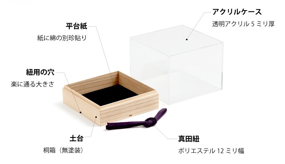 「アクリル」と「桐」それぞれが持つ素材の特性から、中に入れたモノの特別感を演出。