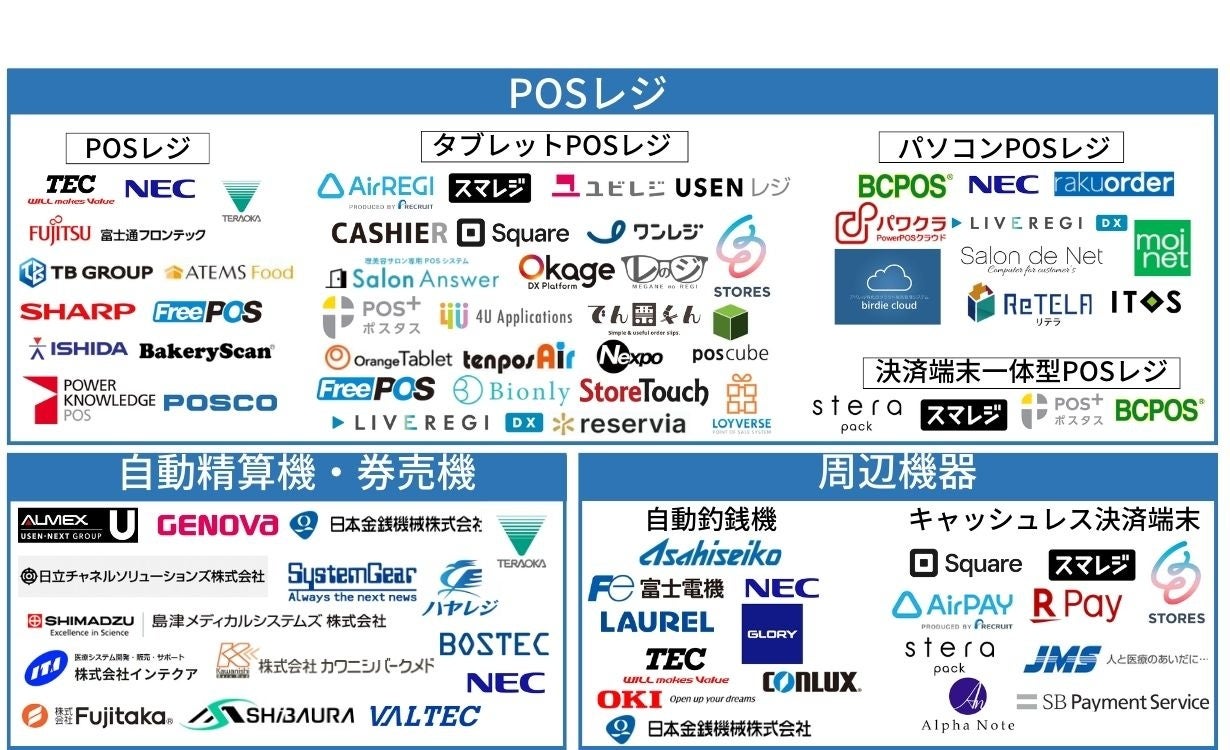 POSレジメーカーを取扱製品の種類別に分類。「ターミナルPOSレジ」「タブレットPOSレジ」「パソコンPOSレジ」「決済端末一体型POSレジ」の主要メーカー一覧がわかります。