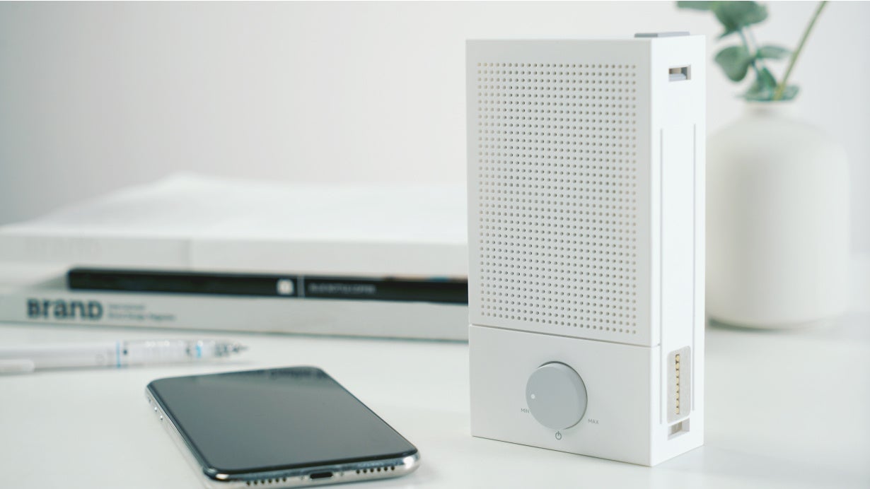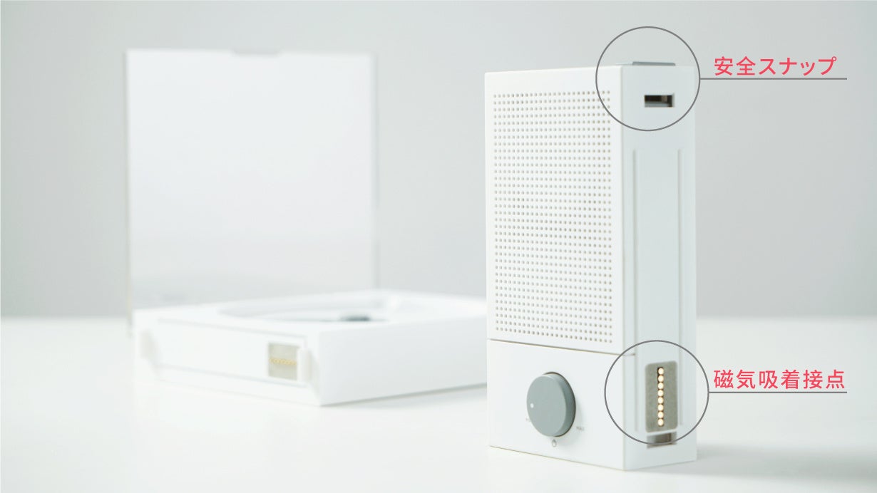 白基調とグレーの配色で、SPLITの背面には折り畳みのできるスタンドがついており、場所を選ばずに置くことができます。4つのボタンと1つの回旋ノブのみですべての操作が完結されます。