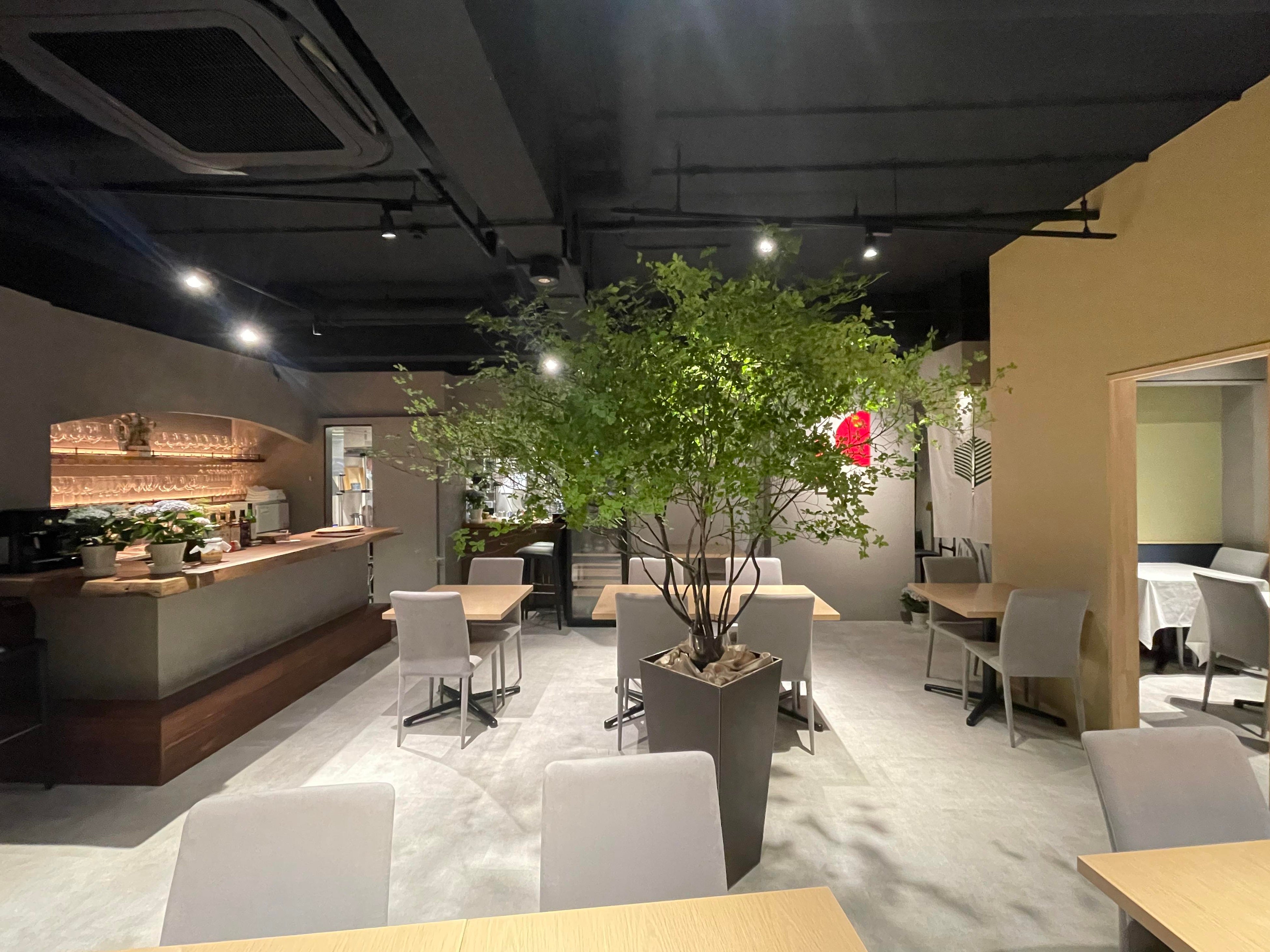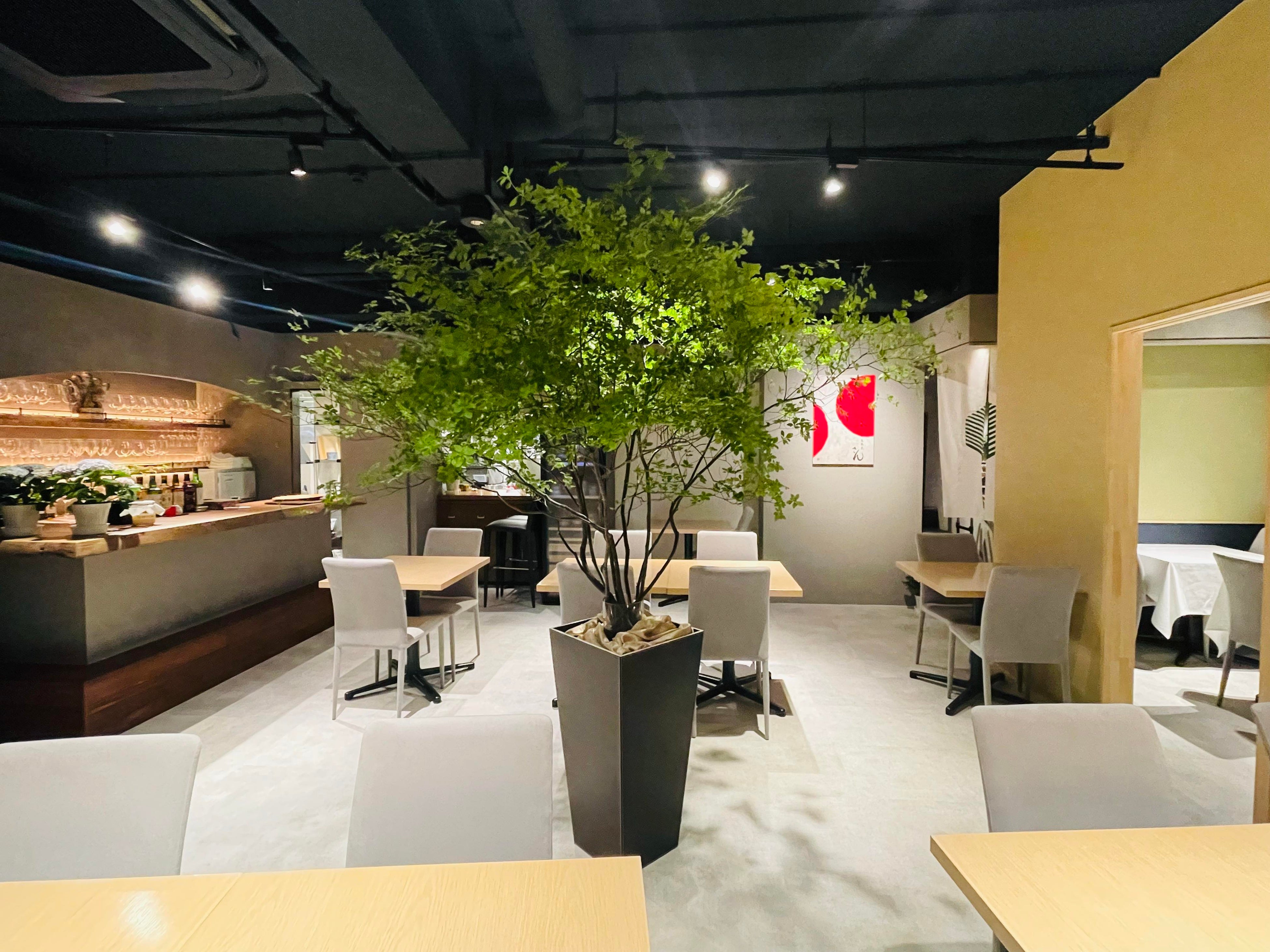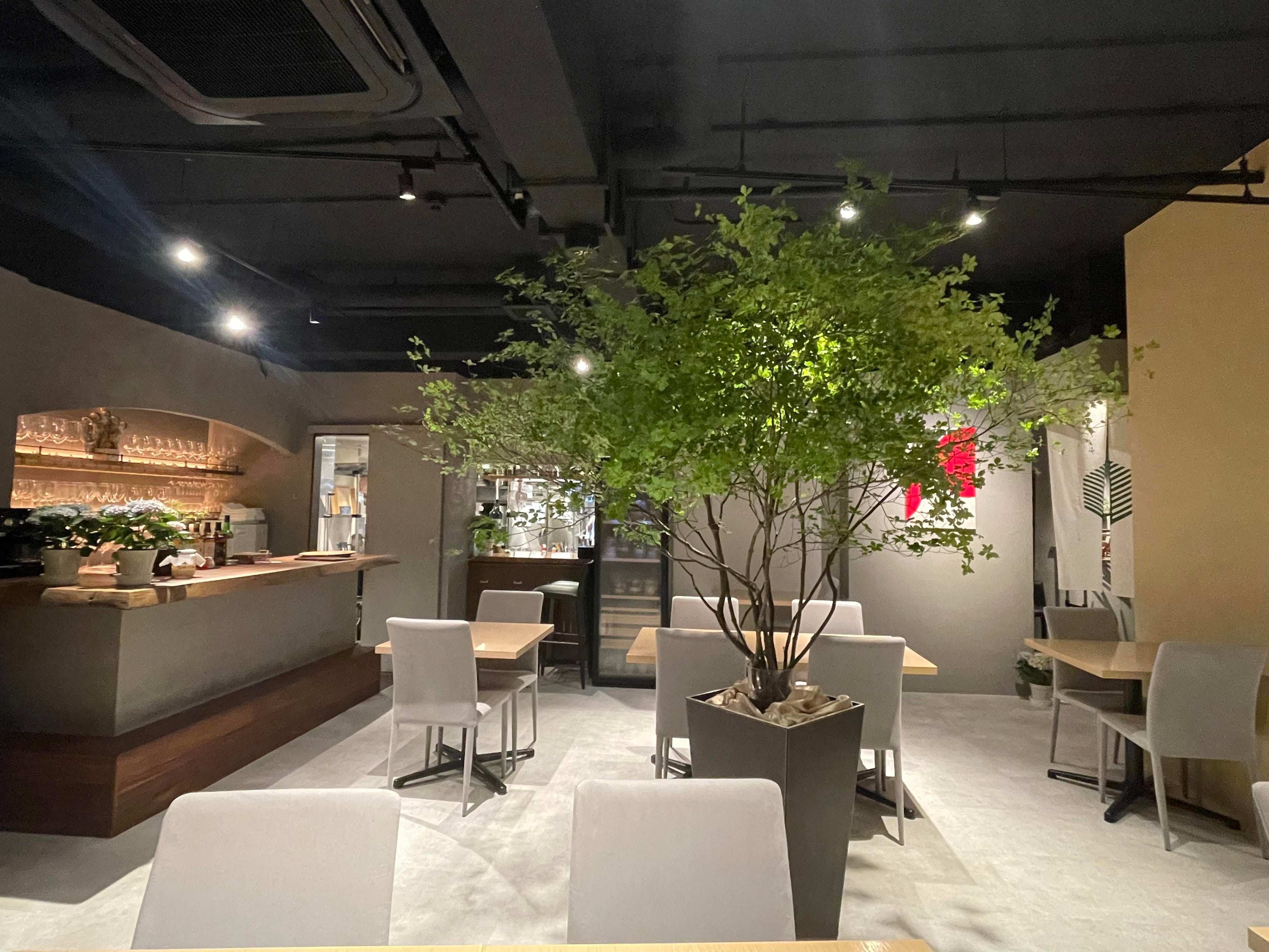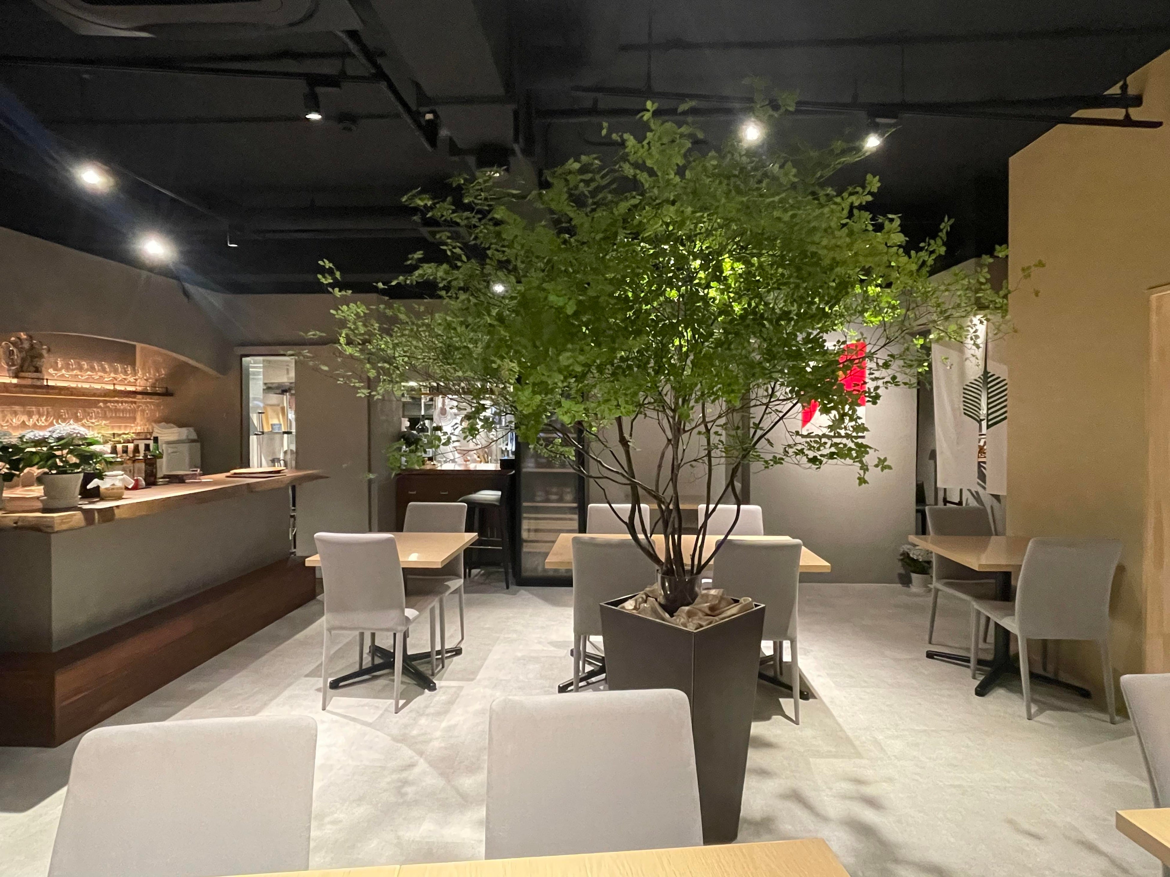 店内は中心にある緑の植木が特徴。自然の中に居るような安心感や居心地の良さの中でお食事を楽しんでいただきたいと、松田女将がこだわり抜いた内装です。個室も1室ございますので、是非お問い合わせください。