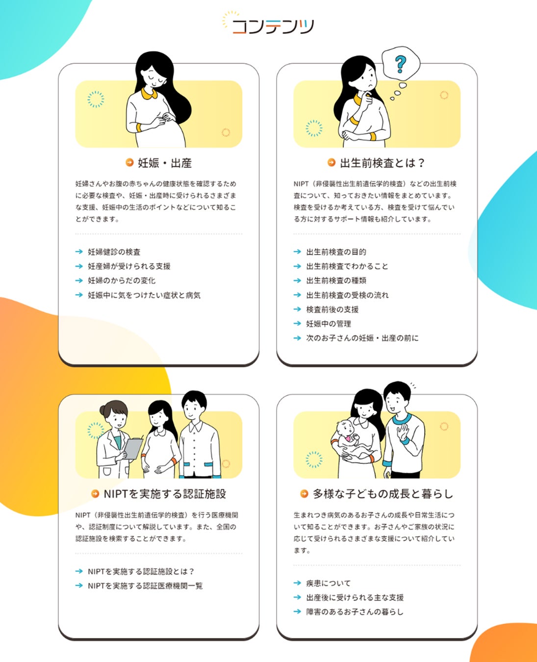 本サイトでは、妊婦健診や妊娠中の生活のポイント等の基本的な情報をはじめ、出生前検査や認証医療機関に関する解説、不安や悩みの相談先、妊産婦が受けられるさまざまな支援等について、6本のアニメーション動画を交え、分かりやすくお届けしています。