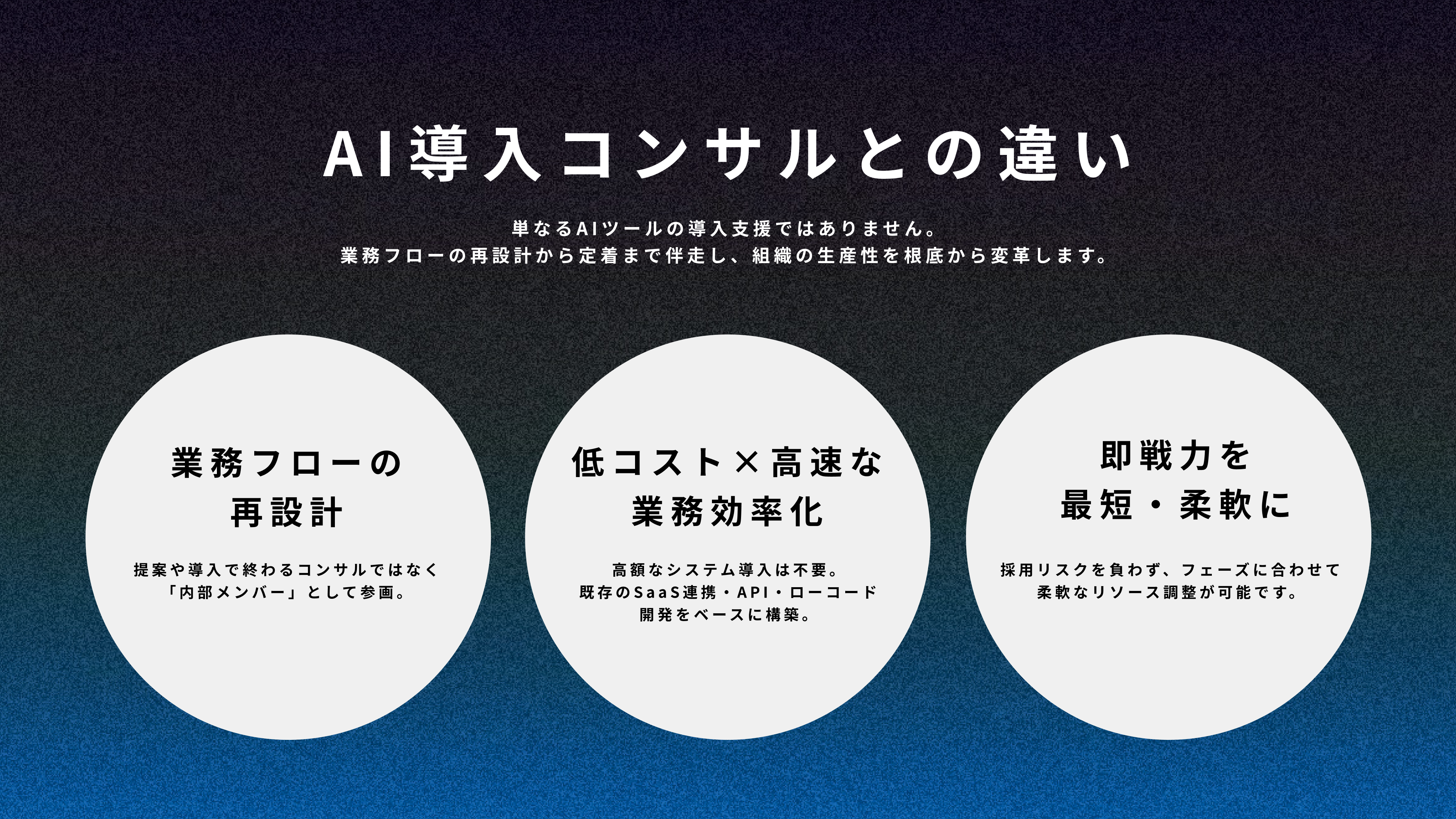 本サービスは、即戦力のAI(DX)推進担当・責任者を最短即日マッチングすることをコンセプトに、AIを前提とした業務設計・実務運用・定着までを一気通貫で支援する、AI人材のマッチングサービスです。