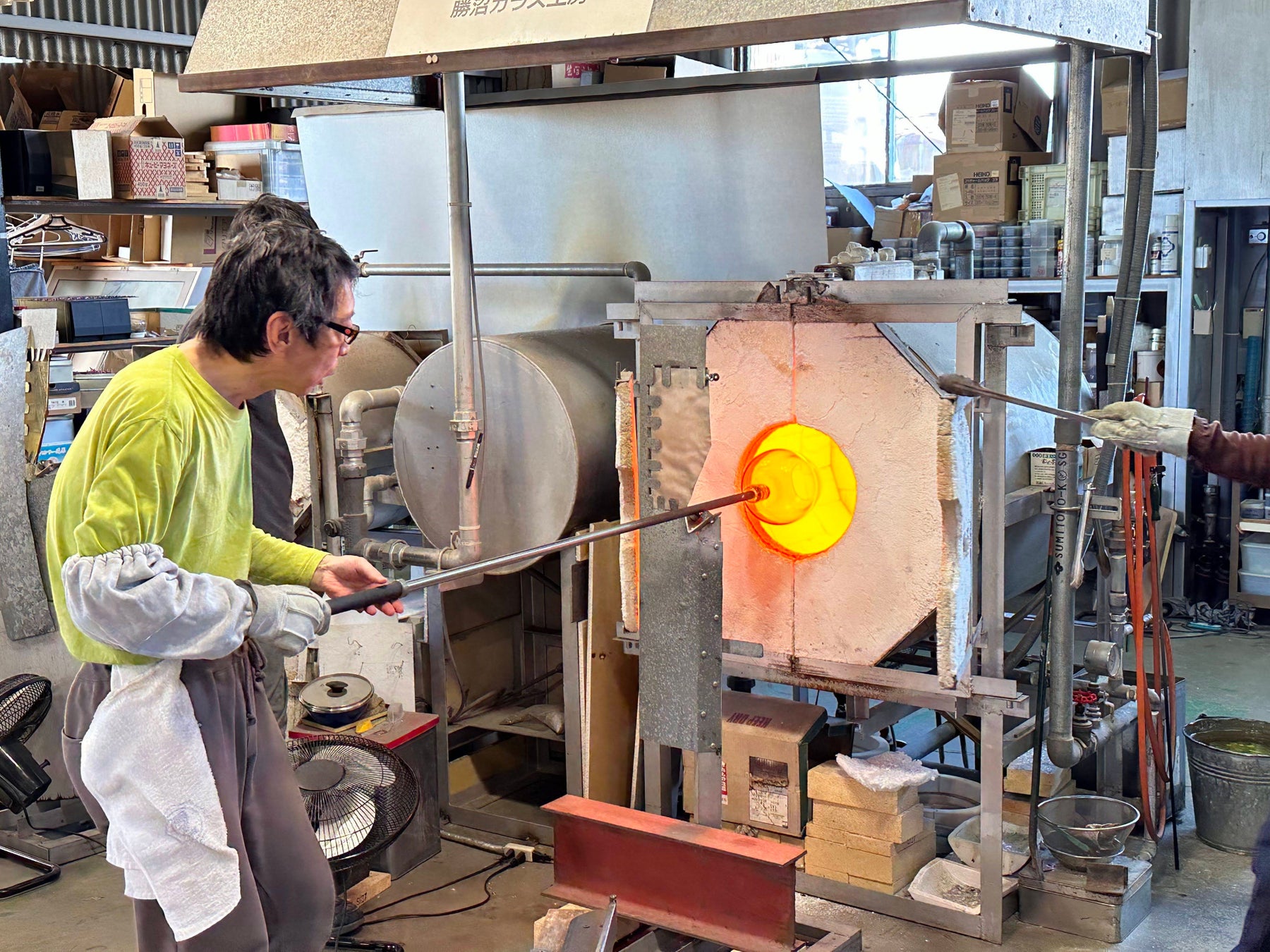 解体が完了したガラスをカレット状にし、1100℃という高温の炉に入れていきます。10時間以上かけて炉内で溶かし、次の姿に生まれ変わるのを待ちます。線香花火のように筒の先にくっついたガラス。ここから職人の技でゆっくりと膨らませていきます。何度もガラスを足し、ガラスを吹いて膨らませたら、容器の上部分はカットして穴を開けますが、反対に底部分はガラス底部分をくっつけなければなりません。様々な工程を経てようやく形になっていきます。