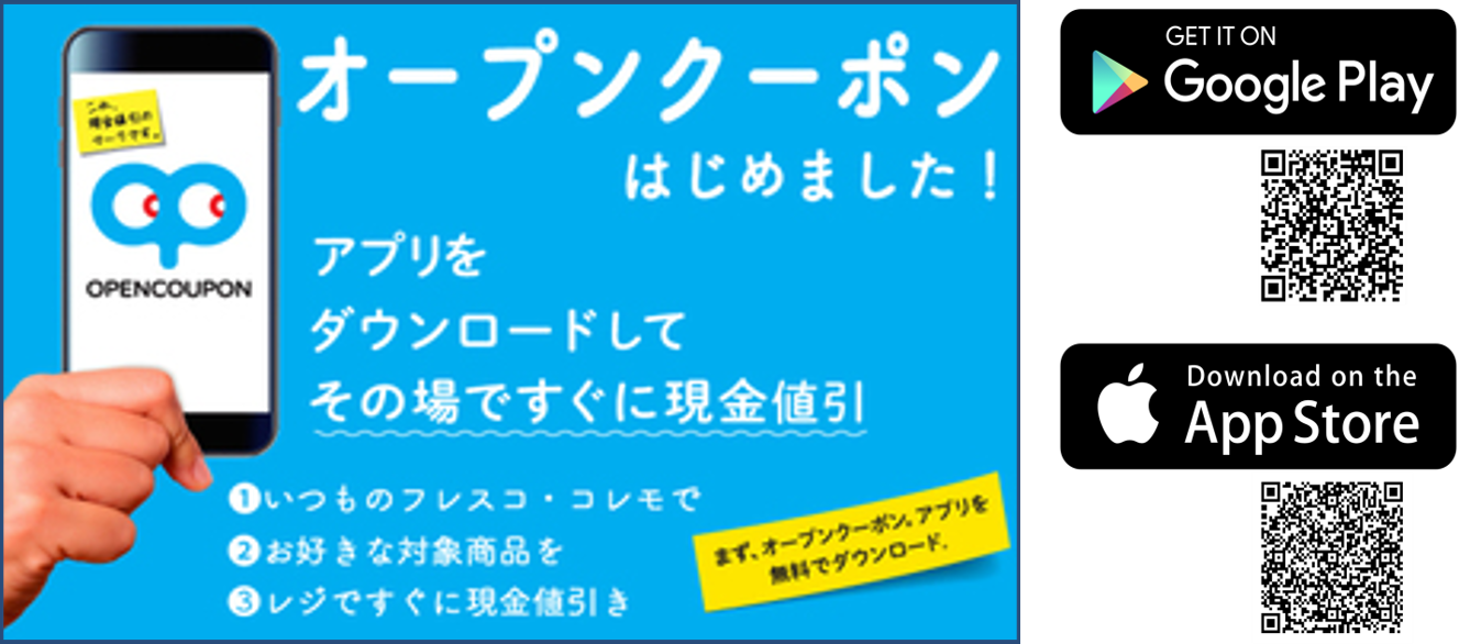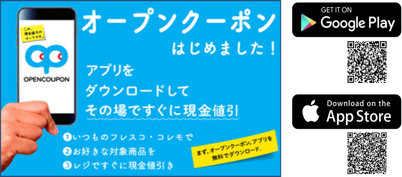 【新登場】相次ぐ値上げにお困りの生活者に、新たな無料クーポンアプリ「オープンクーポン」が3月6日(月)より、FRESCO* 全店にて展開開始。順次エリアも拡大!