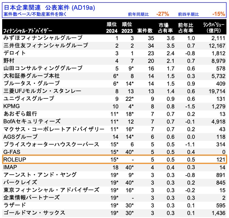 「M&Aリーグテーブル(日本M&Aレビュー ファイナンシャル・アドバイザー 2024年第1四半期)」にて、公表案件数ベース15位にランクイン