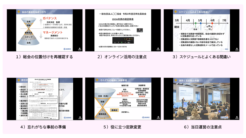 業界団体などの総会運営のよくある間違い、オンライン開催のテクニック、忘れがちな事前準備などを学べるセミナーです。