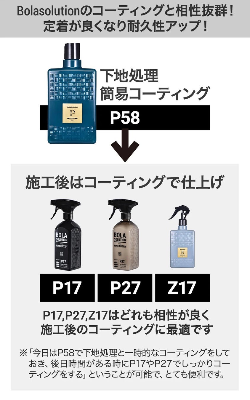 【新商品】BOLASOLUTION(ボラソリューション)から2種類の「下地処理+コーティング剤」が登場!①【ONCE:オールインワン型】、②【P58:雨染み・イオンデポジット落とし特化型】