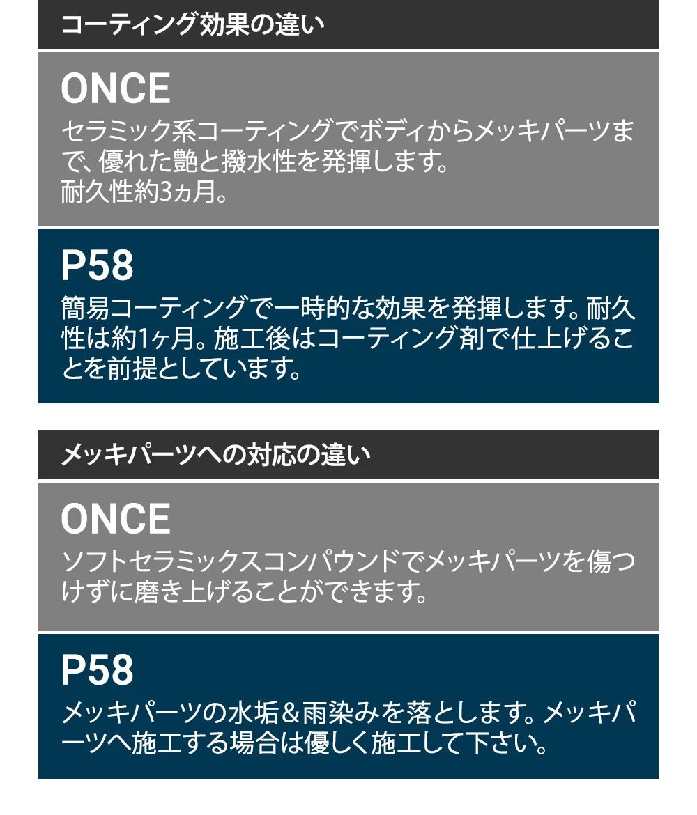 ①【ONCE】は「下地処理からコーティングまで、これ1本でオールインワンで完結します。」②【P58】は「雨染み・イオンデポジット落としに特化し、同時に簡易コーティングの効果も発揮します。」