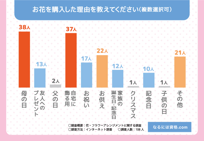 母の日をはじめ、お祝いや記念日、誕生日など、大切な周りの人にプレゼントする用途でお花が多く利用されていることが分かりますね。
