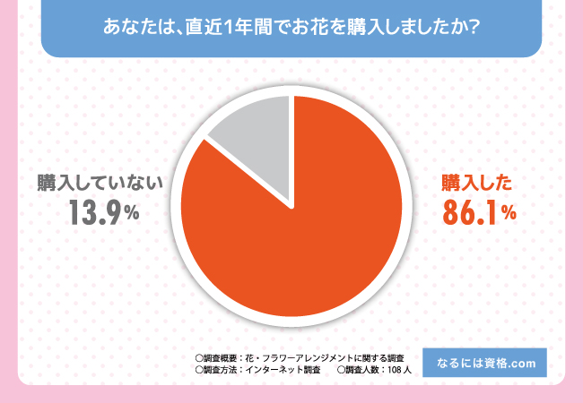 そこで今回、なるには資格.com(https://www.naritaijob.com/)(株式会社Nanea 本社:福岡県、代表取締役:石丸大輔)は、全国の男女108名を対象に「直近1年間で花を購入した経験」に関するアンケートを実施しました。