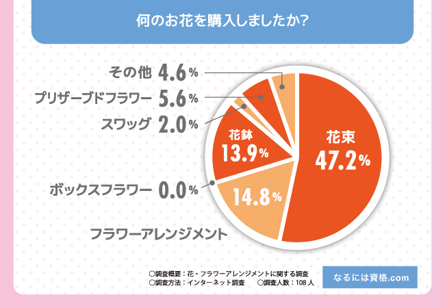 『花束』が47.2%、『フラワーアレンジメント』が14.8%、『花鉢』が13.9%、『プリザーブドフラワー』が5.6%、『スワッグ』が2.0%、『その他』が4.6%、という結果になりました。
