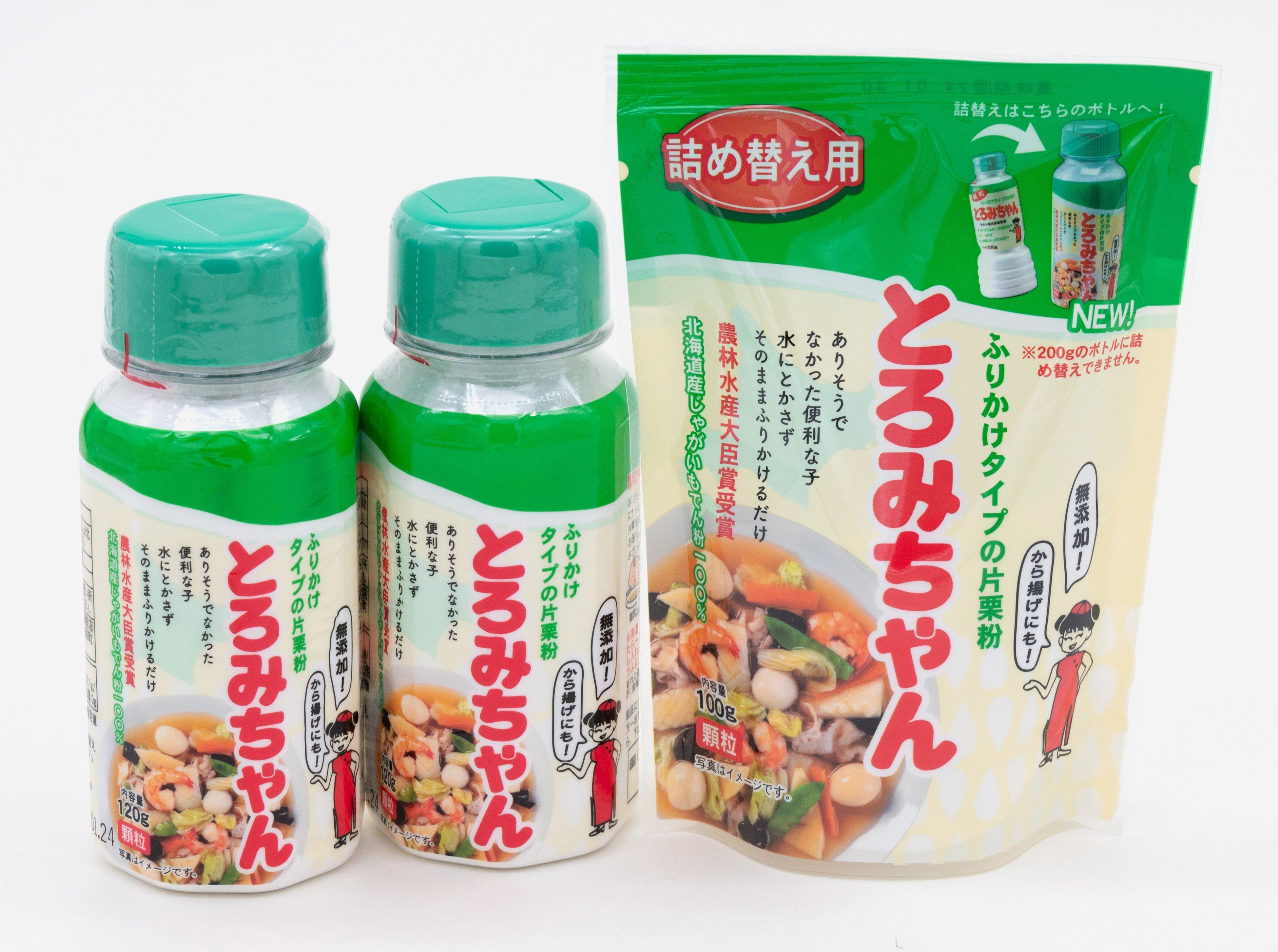 「顆粒片栗粉とろみちゃん」は、1992年に開発された水に溶かさずそのまま料理にふりかけて使える片栗粉(じゃがいもでん粉)です。原材料は北海道産じゃがいも100%。化学物質やアレルギーの原因物質は一切含まれておらず、料理のあんかけだけでなく、離乳食や介護食など幅広くお使いいただくことができます。