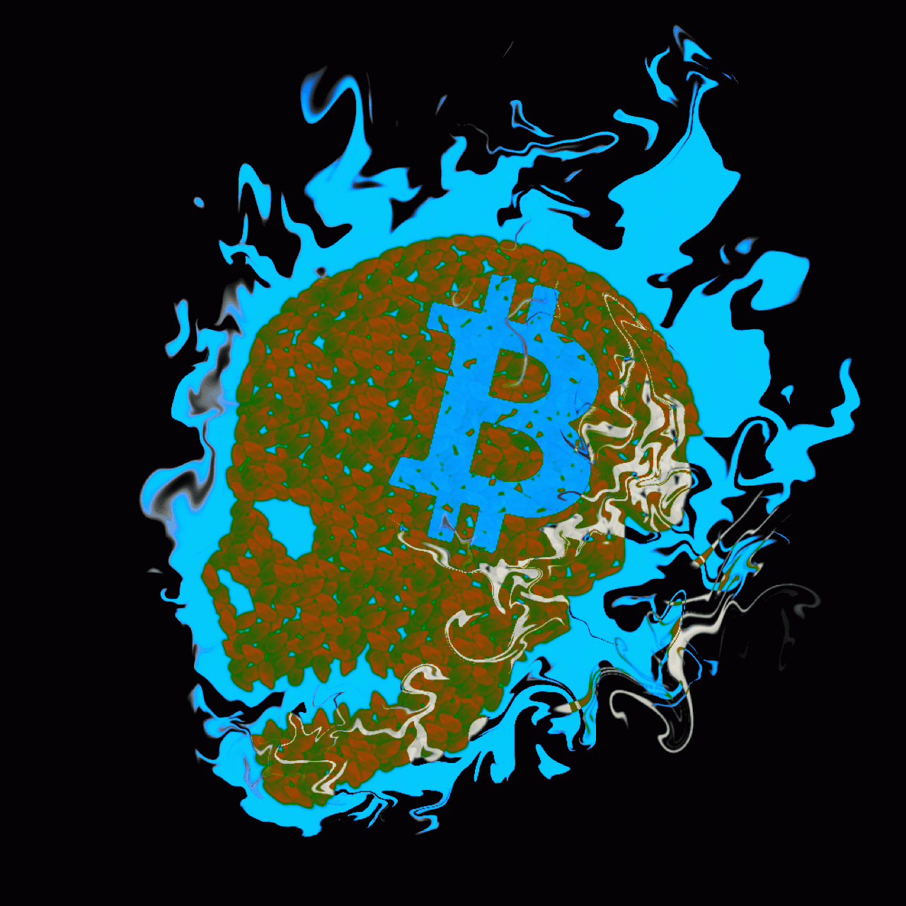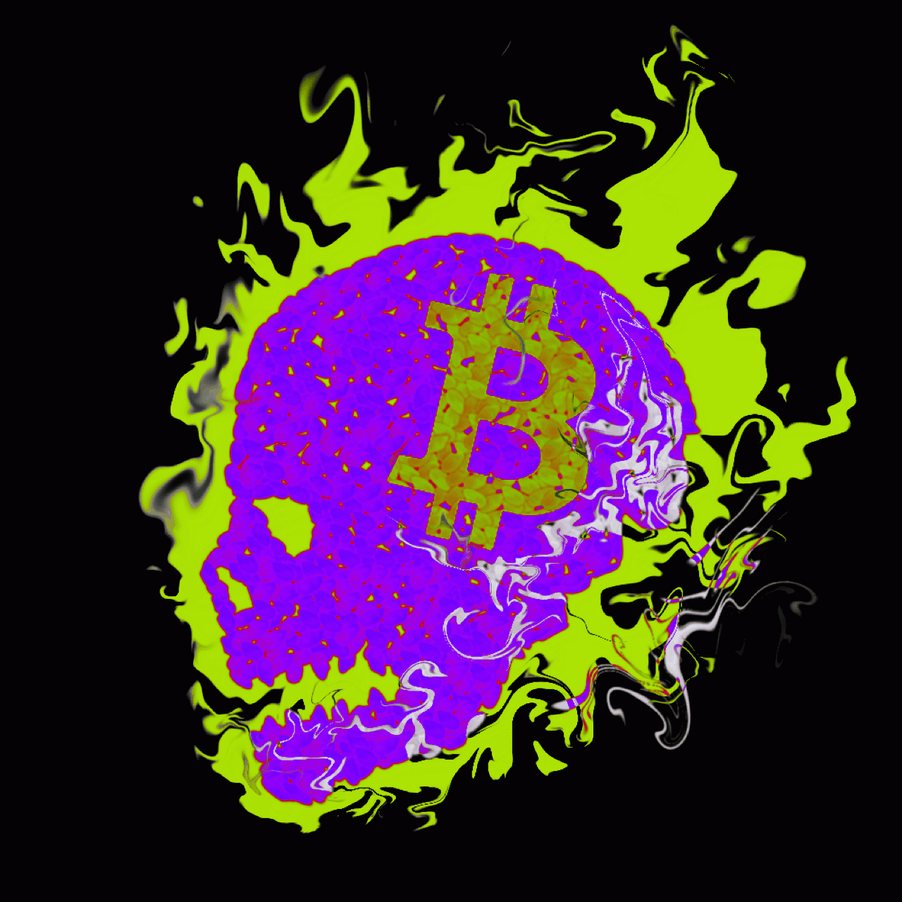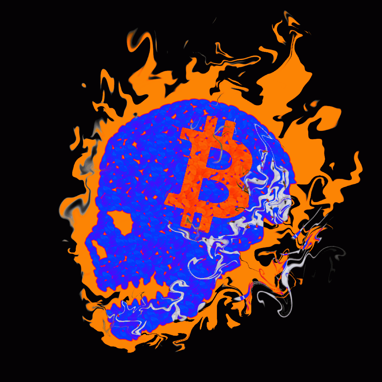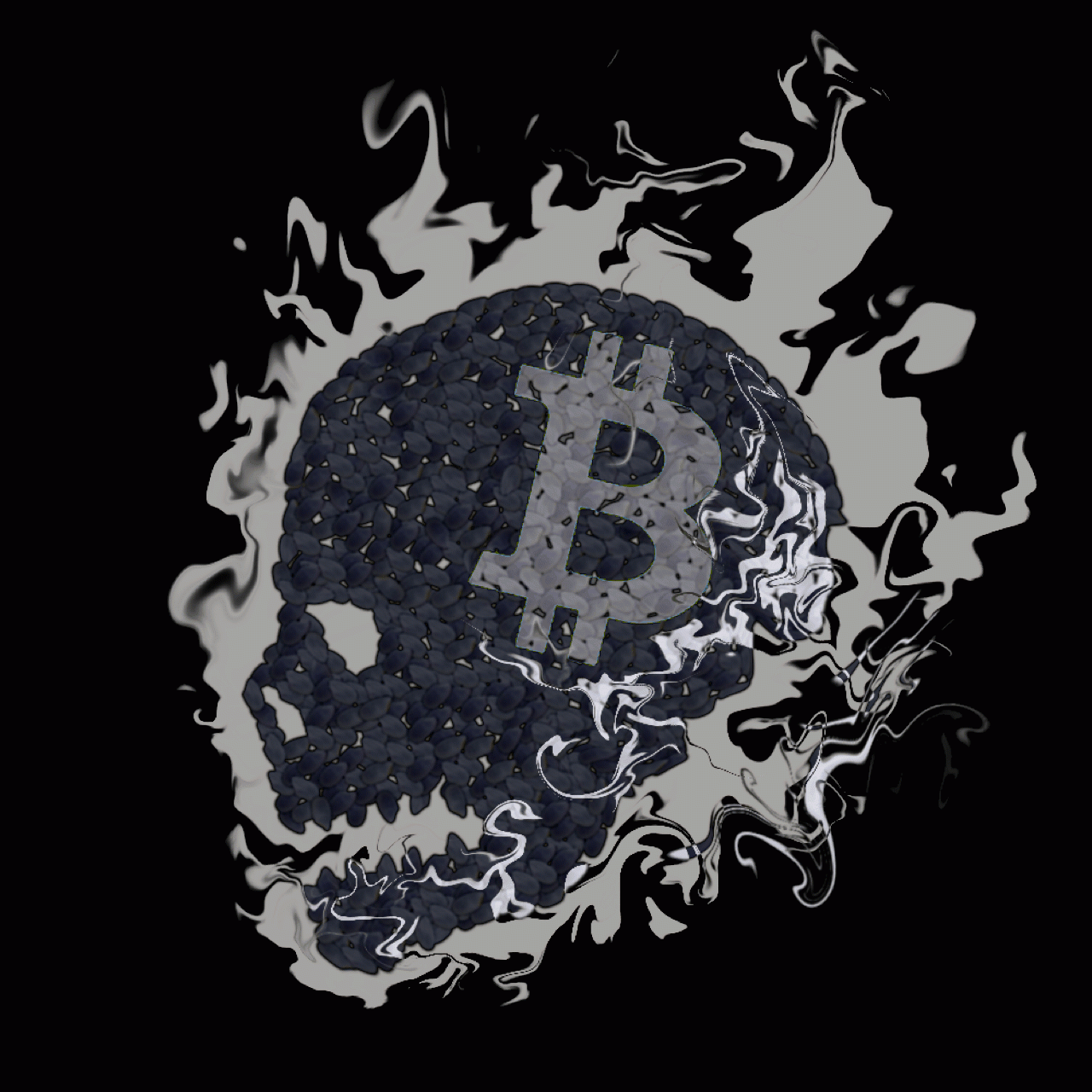 メインモチーフである頭蓋骨は、実際の米粒をスキャンしたものを並べて構成されています。私のアーティストとしてのプロフィール写真は、頭部がお米でできているため、これが最も自分をよく表現するモチーフだと考えました。米は、日本古来からの主食であり、また通貨としての機能も併せ持っていたことから、日本発のクリプトアーティストのシンボルとして相応しいものであると私は思っています。今回は、その頭蓋骨にビットコインのロゴと炎の描写を組み合わせて、新しいメインモチーフに据えました。(余談ですが、火が燃える擬態語に「メラメラ」というのがあるので、私の作品には火のモチーフがよく登場します)