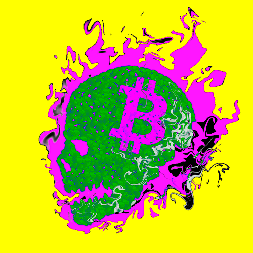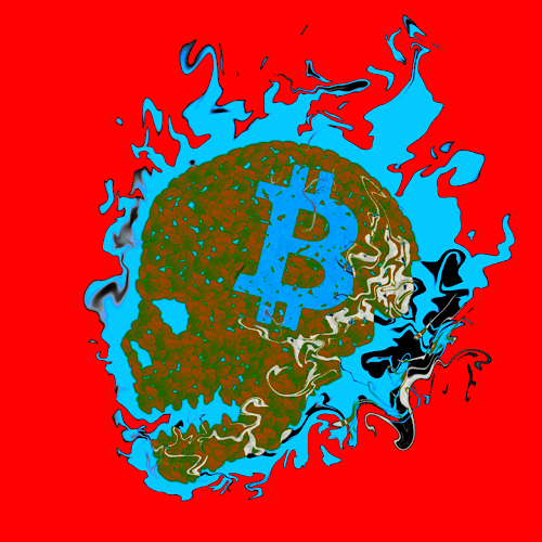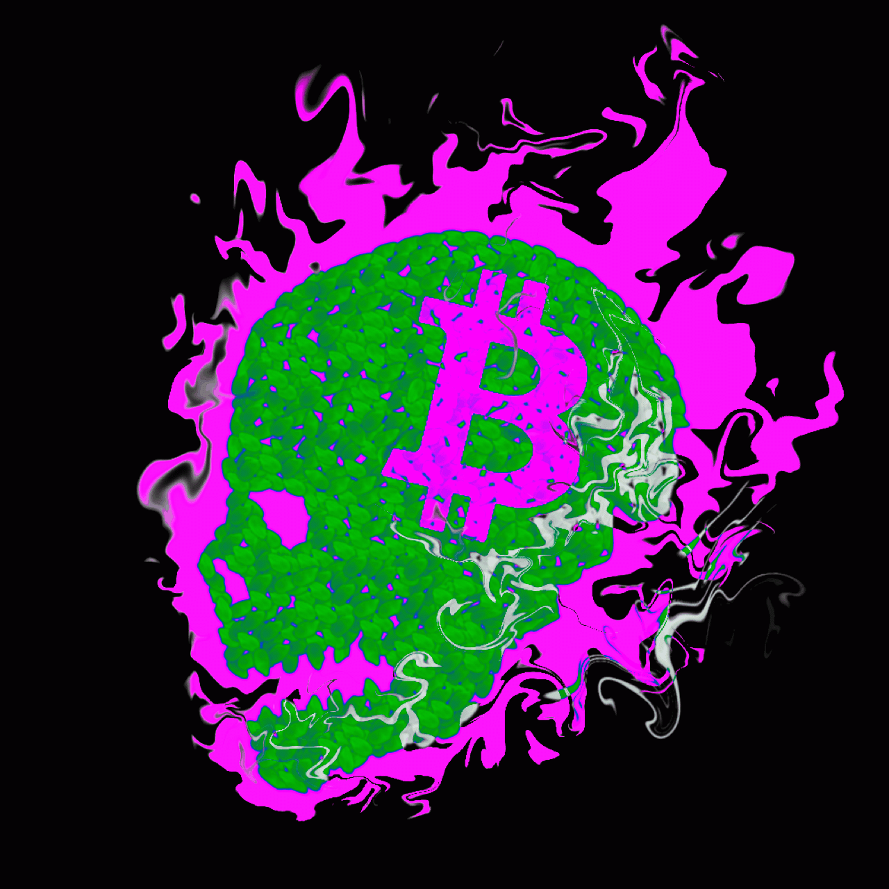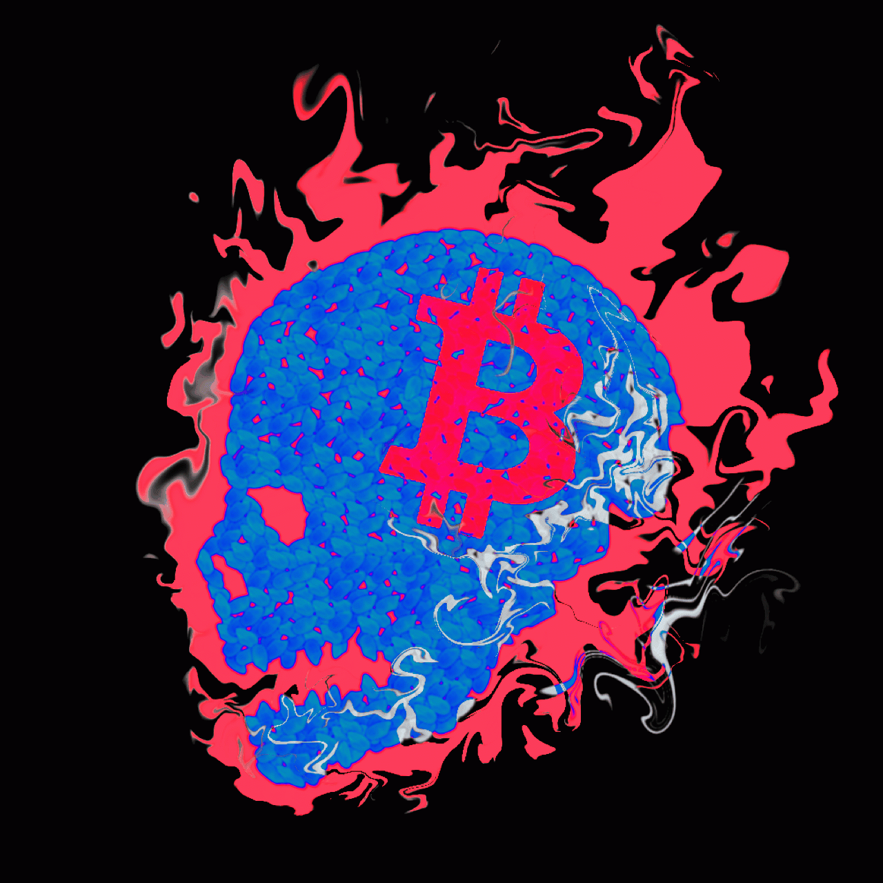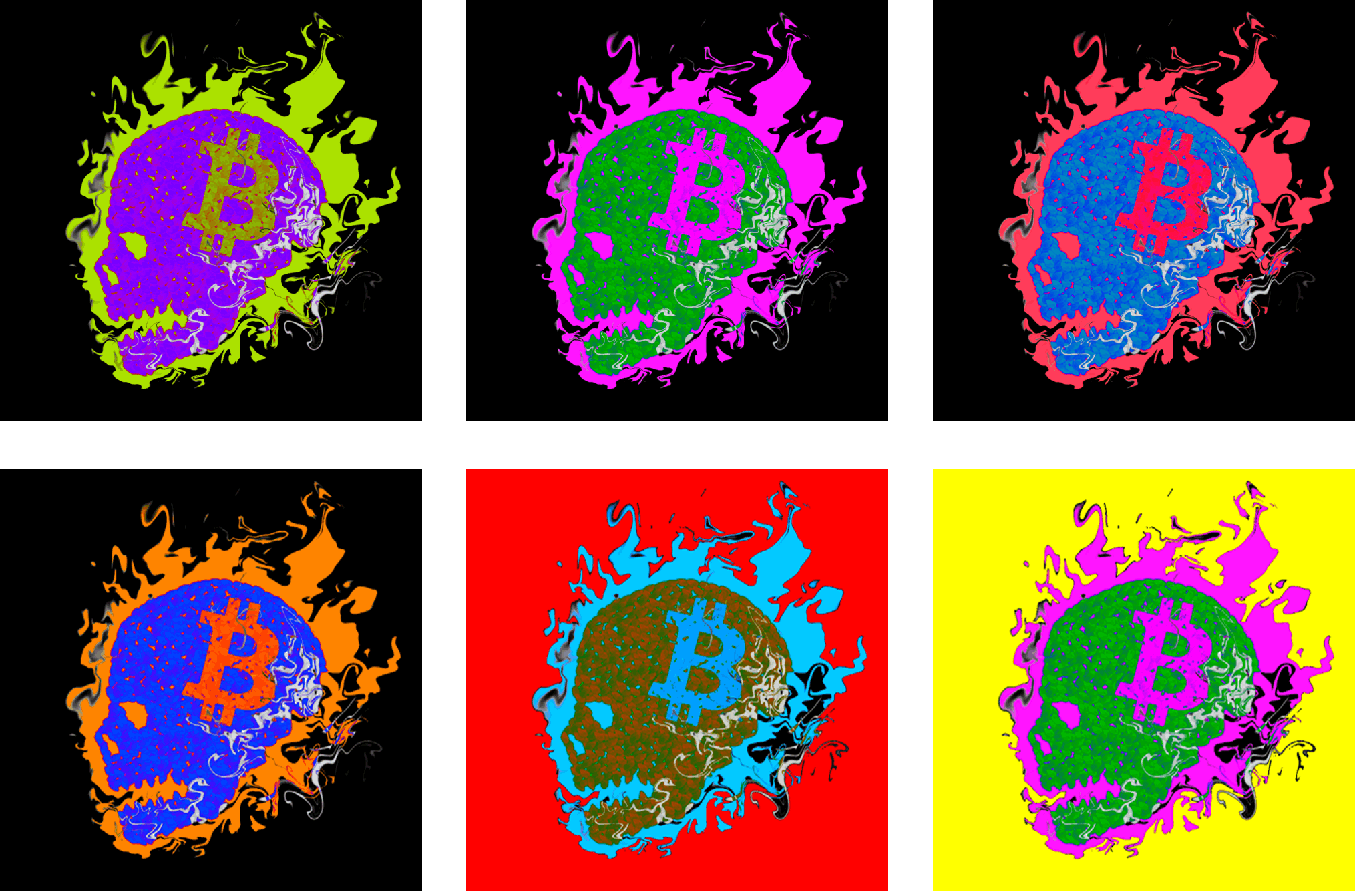 メインモチーフである頭蓋骨は、実際の米粒をスキャンしたものを並べて構成されています。私のアーティストとしてのプロフィール写真は、頭部がお米でできているため、これが最も自分をよく表現するモチーフだと考えました。米は、日本古来からの主食であり、また通貨としての機能も併せ持っていたことから、日本発のクリプトアーティストのシンボルとして相応しいものであると私は思っています。今回は、その頭蓋骨にビットコインのロゴと炎の描写を組み合わせて、新しいメインモチーフに据えました。(余談ですが、火が燃える擬態語に「メラメラ」というのがあるので、私の作品には火のモチーフがよく登場します)