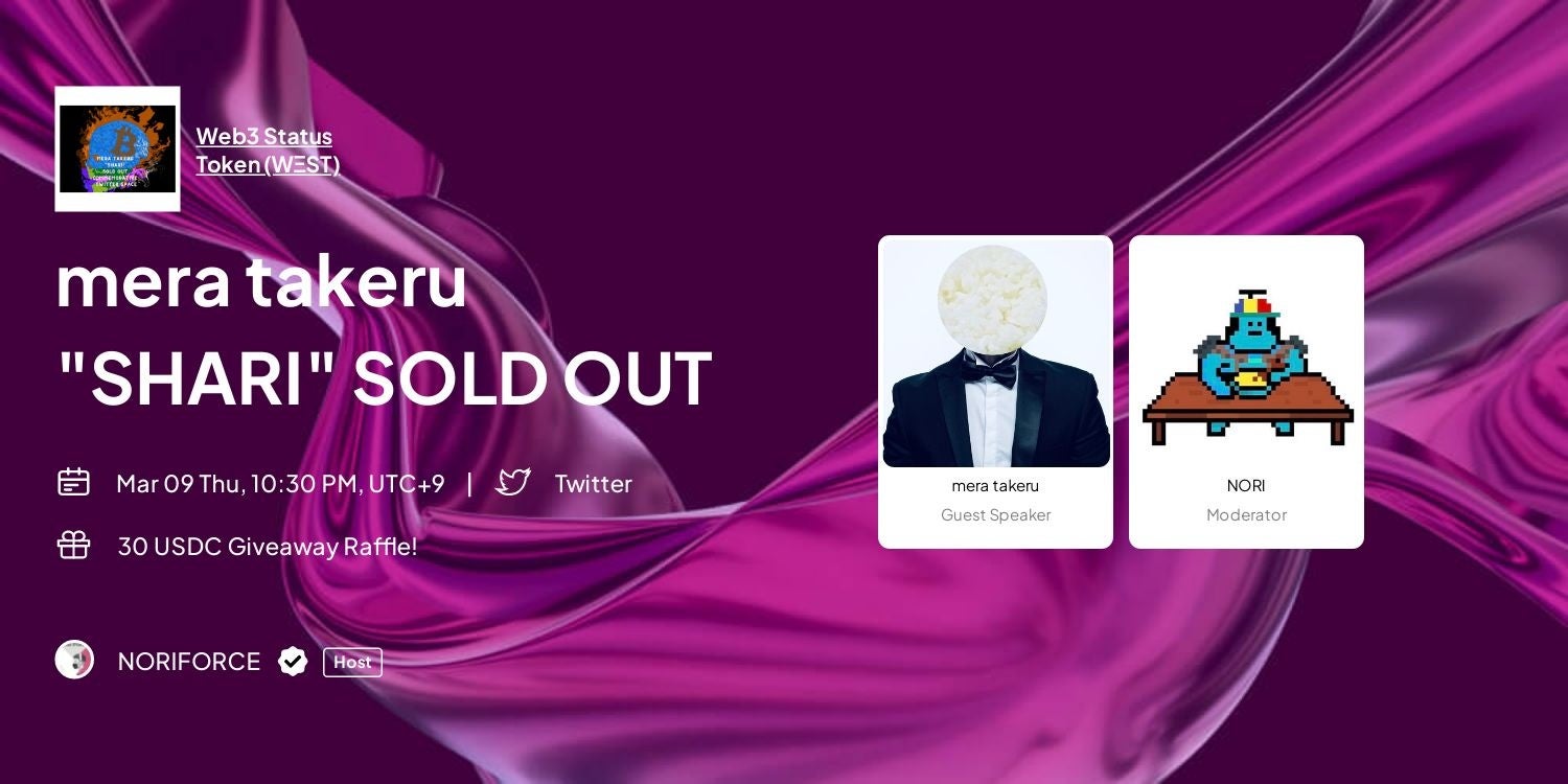 mera takeruの活動4周年と「SHARI」の完売を記念するミートアップを開催いたします。会場は、NFTギャラリー&コミュニティスペース「EDGEoff代官山」です。