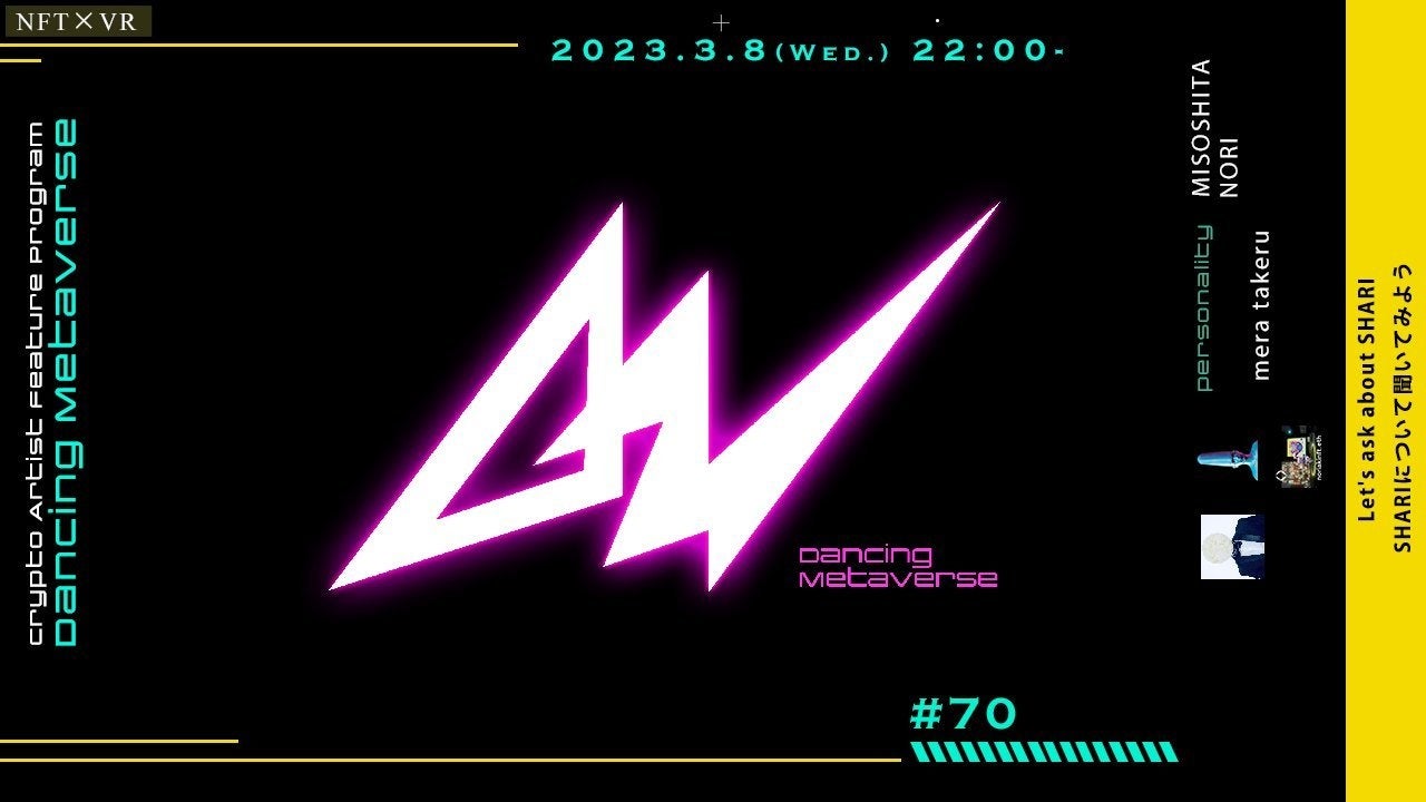 VRクリエイターのMISOSHITA氏が主催する、NFT×VRをテーマにクリプトアーティストを中心に招いてお話を聞くYoutube番組「Dancing Metaverse(ダンシングメタバース)」。