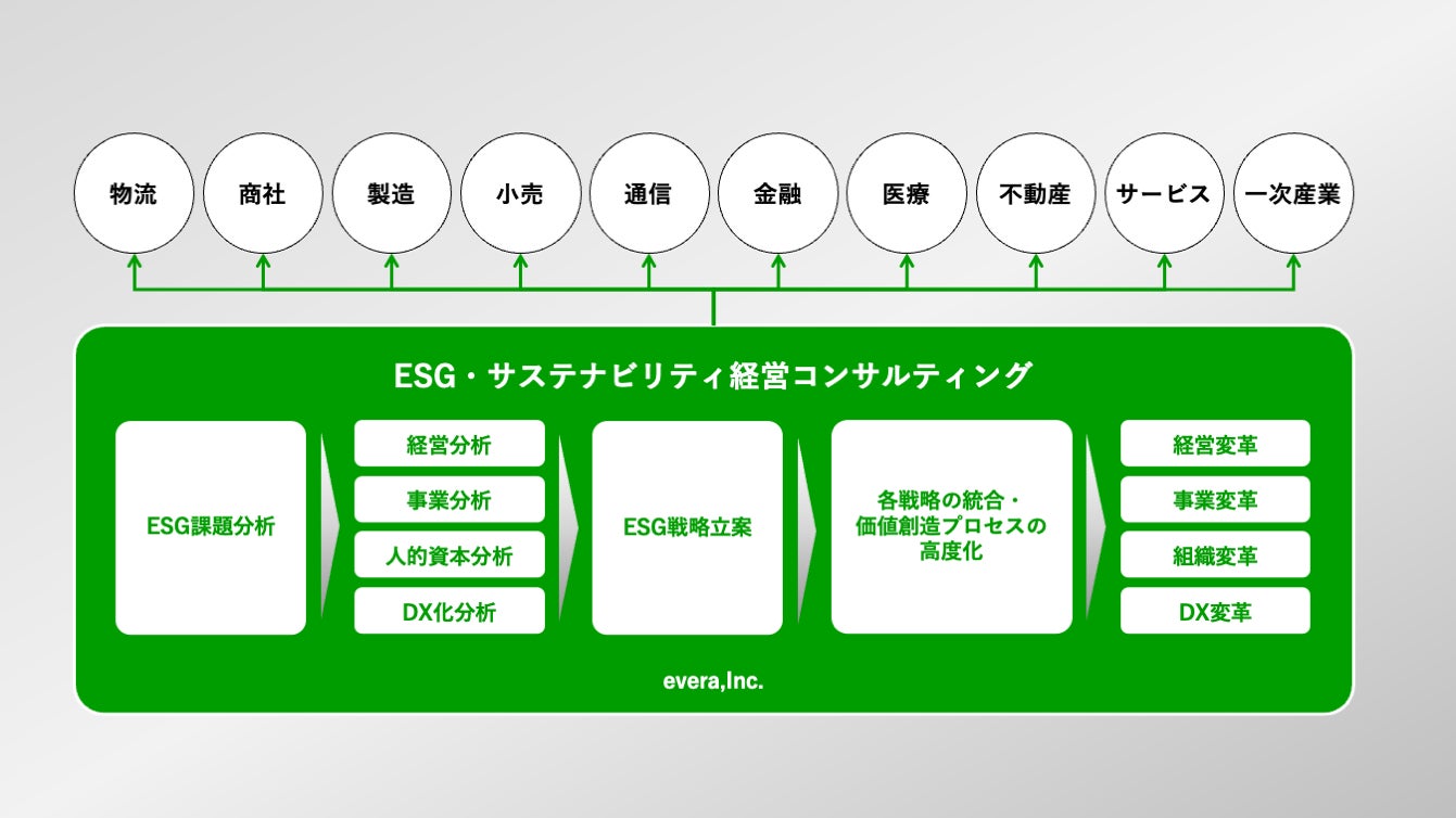 株式会社evera(本社:東京都中央区、代表取締役社長:福嶋 涼、以下evera)は、企業のESGにまつわる様々な課題解決とサステナビリティ向上を支援するため、「ESG・サステナビリティ経営コンサルティングサービス」の本格提供を開始しました。「攻めのESG」に特化し、戦略立案からイノベーション実現に至るまでを伴走支援いたします。