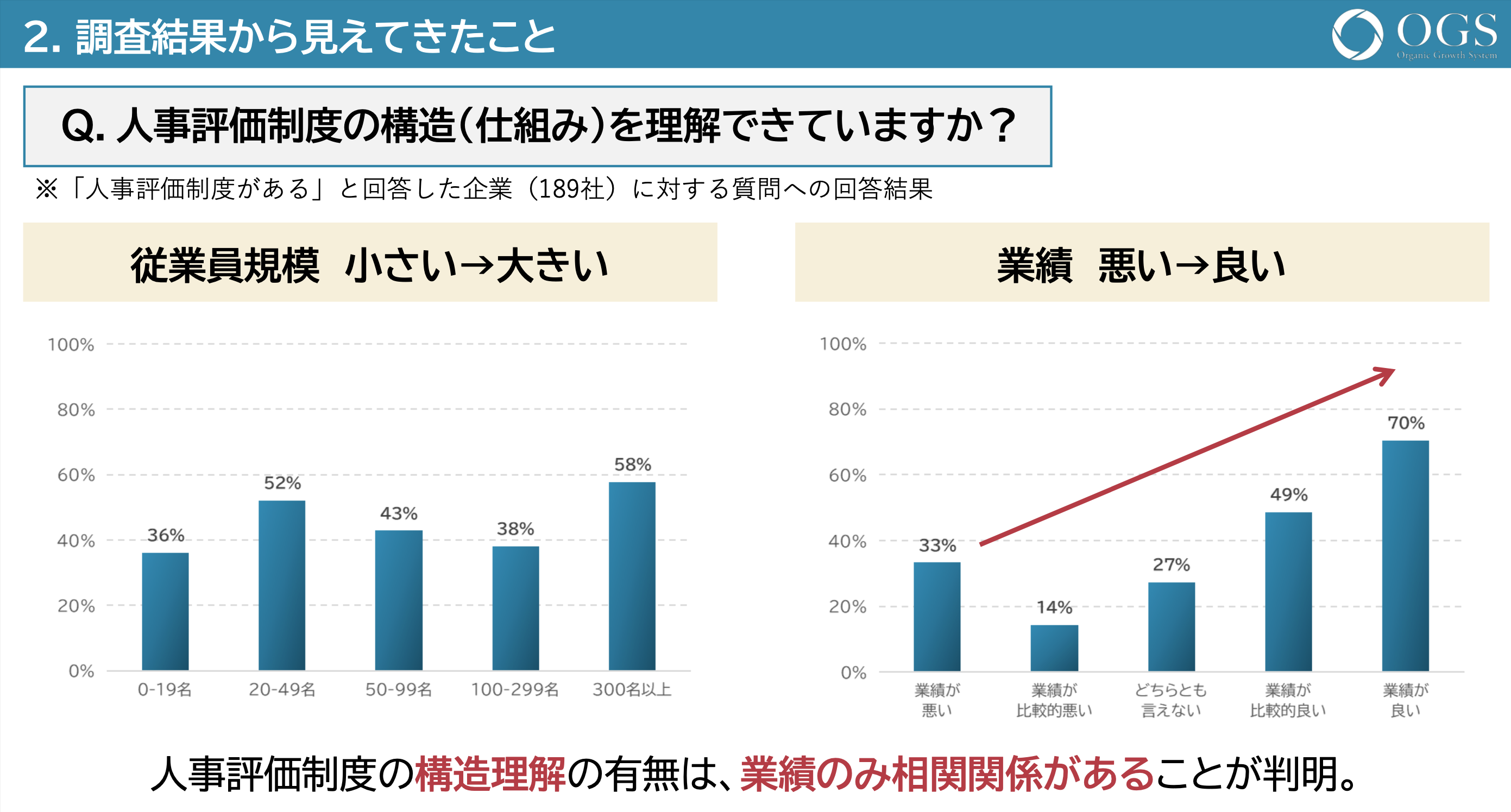 「Q2.人事評価制度の構造(仕組み)を理解できていますか?」(n=189)に対して、従業員規模と構造理解の有無に相関関係は見られず、業績とのみ相関関係が見られました。つまり、業績が伸びている企業ほど評価制度の構造理解ができており、経営者や管理職といった評価者側が人事評価制度の構造(仕組み)を正しく理解できていることが、事業成長につながる 「鍵」 となります。