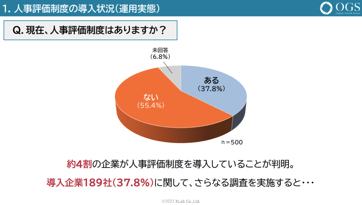 「Q1.現在、人事評価制度はありますか?」(n=500)に対して、「ある」が189社(37.8%)、「ない」が277社(55.4%)、という回答となりました。人事評価制度を導入している企業の内訳を分析すると、人事評価制度の導入と従業員規模、業績には相関関係があることが判明しました。つまり、今後の事業成長を実現していくためには、「人事評価制度」は欠かせない要素の一つと言えます。