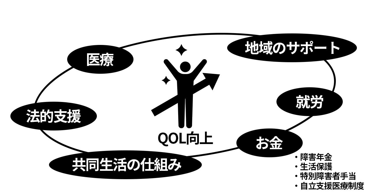 障害がある方のQOL向上のための要素はいくつもあります。 主治医が介入している「医療」、ウェルビー様が支援されている「就労」、住環境確保の為の「共同生活の仕組み」、 社会復帰の為の「地域のサポート」、親亡き後を想定した「法的支援」。そしてそれらを実行する時に裏付けとなるのが「お金」です。