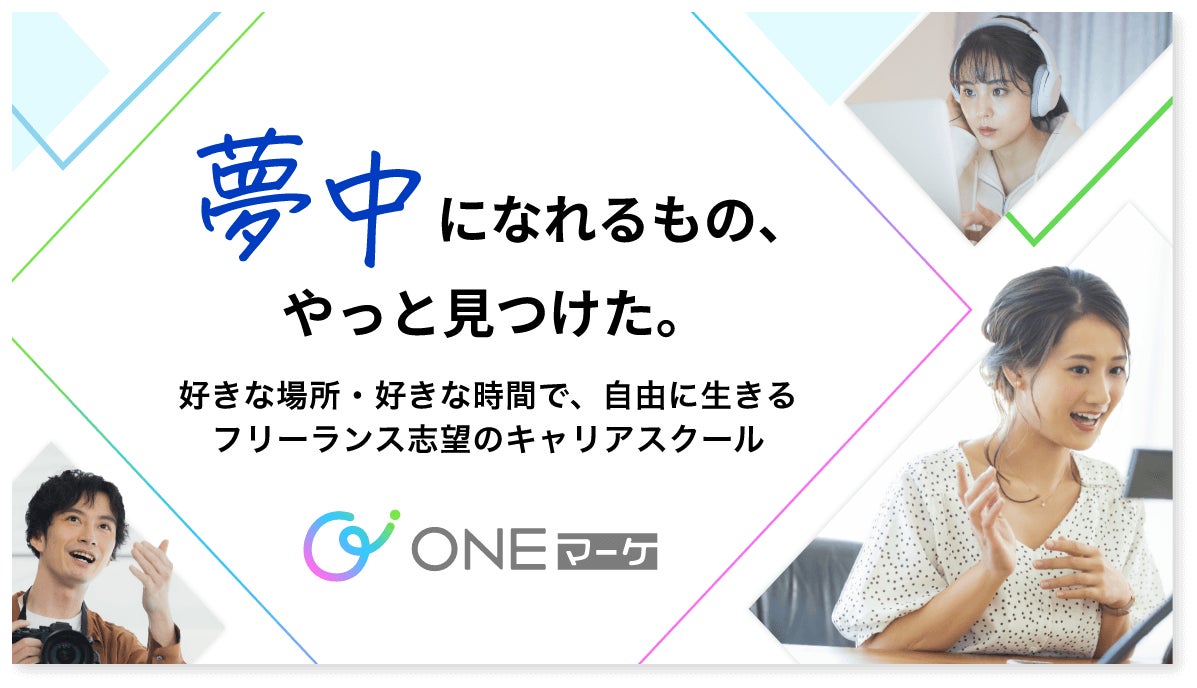 好きな場所・好きな時間で、夢中で生きていく。ONEマーケは、”好き・得意”を活かして自由な働き方が目指せるフリーランス志望のための新しいキャリアスクールです。