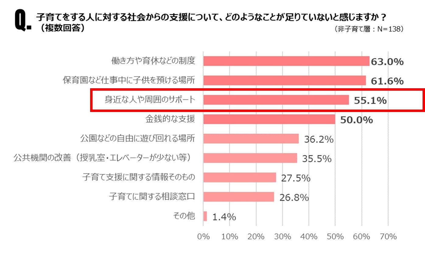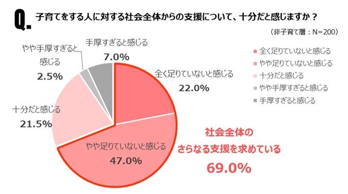 非子育て層に対し『子育てをする人に対する社会全体からの支援について、十分だと感じますか?』と聞いたところ、子育て経験のない人でも69.0%が“さらなる社会全体の支援”を求めていることがわかりました。