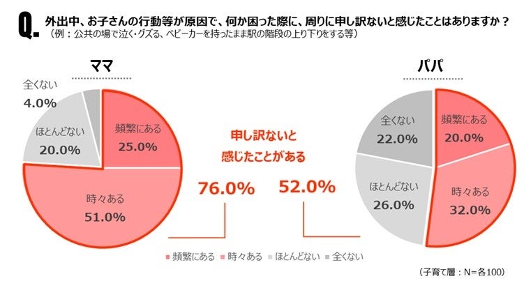 全国の子育て層である女性・男性各100名に対し、『外出中、お子さんの行動等が原因で、何か困った際に、周りに申し訳ないと感じたことはありますか?』と聞いたところ、ママの約8割、パパの半数以上が「申し訳ないと感じたことがある」と答えました。