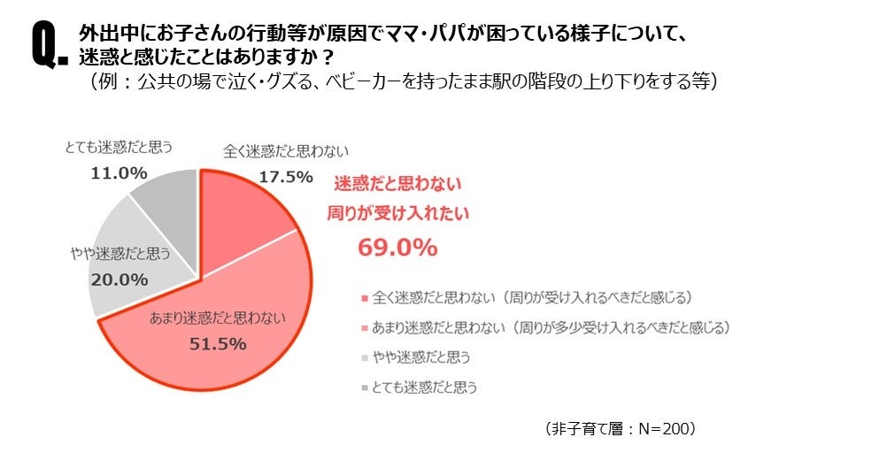 ママの8割、パパの半数以上(52.0%)が“周りに申し訳ない”と思っている一方で、全国の非子育て層200名に対し、『外出中にお子さんの行動等が原因でママ・パパが困っている様子について、迷惑と感じたことはありますか?』と尋ねたところ、約7割は、“迷惑だと思わない”、“周りが受け入れたい”と回答しました。