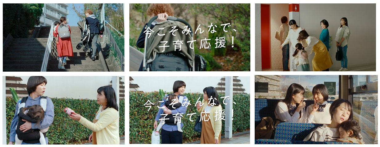 2月26日(日)より新TV CM『今こそみんなで子育て応援』を放映しております。本CMでは、子育て中のママ・パパに対して、周りの人が階段でベビーカーを持ったり、落としものを拾ったりといった、ちょっとした応援をすることで笑顔が増えていく様子を描いています。また、アーティストの曽我部 恵一さんが本CMのために書き下ろした楽曲「晴れ時々、ぼくら」では、日々大変な子育ての中にあるちょっとうれしい瞬間に、勇気と元気をもらえる様子を楽曲に込めています。