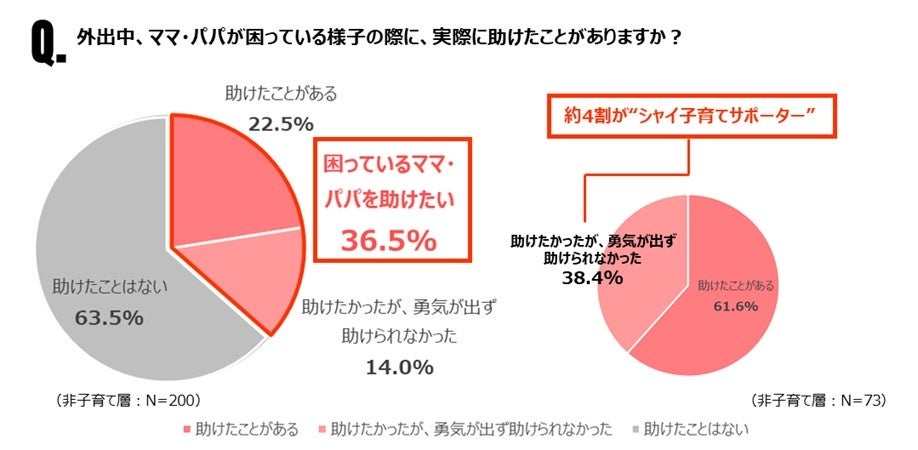 非子育て層の人に対して、『外出中、ママ・パパが困っている様子の際に、実際に助けたことがありますか?』と質問したところ、3人に1人が「困っているママ・パパを助けたい」と回答しました。一方で、助けたいと思っている人のうち、38.4%が「勇気が出ず助けることができなかった」という結果になっています。