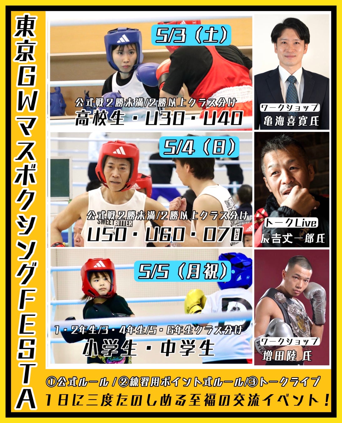 どなたでも参加でき、家族も安心して応援できる模擬試合を中心に、亀海喜寛氏、増田陸氏ら、現役、元日本チャンピオン達のワークショップや、辰𠮷𠀋一郎氏のトークイベントなど、全世代、様々なバックグラウンドの方が、参加可能なイベントです。