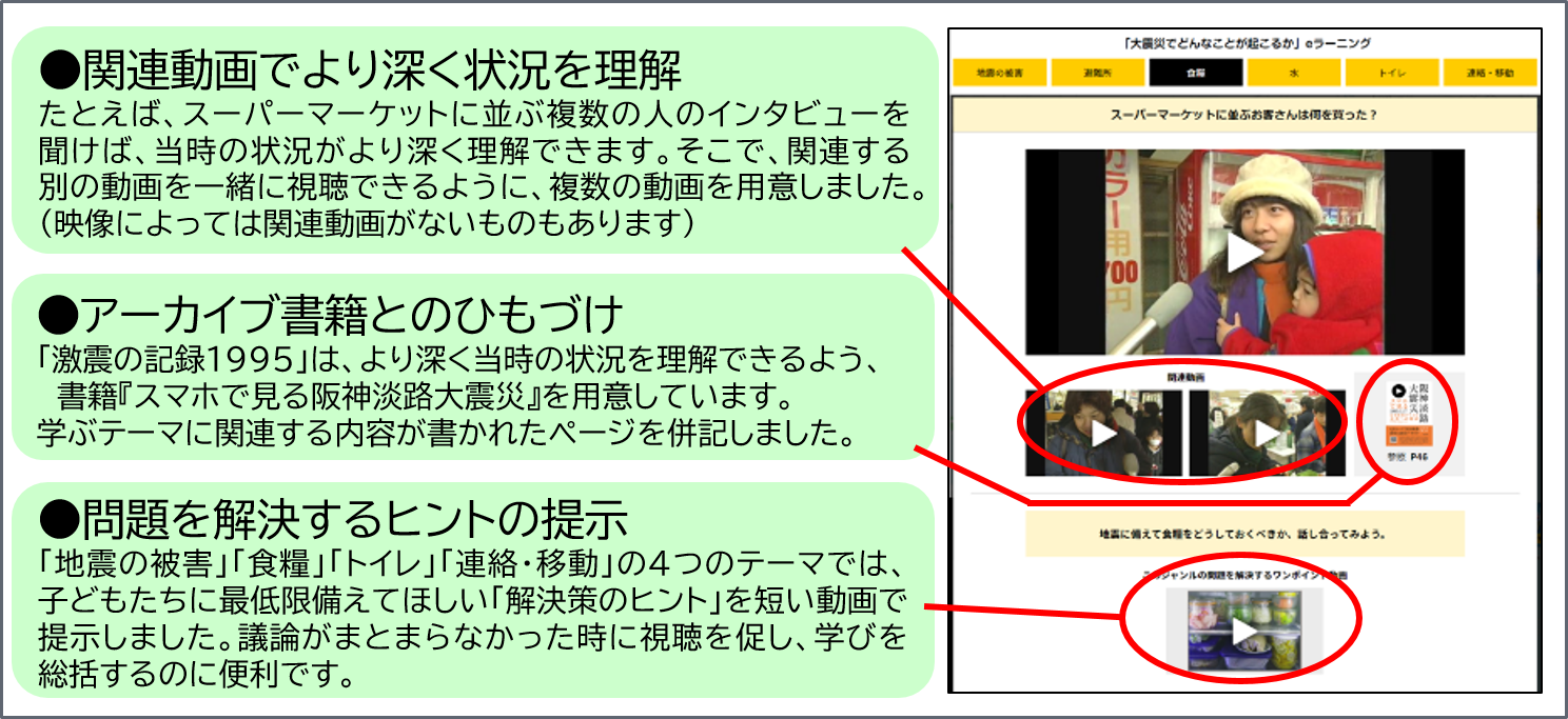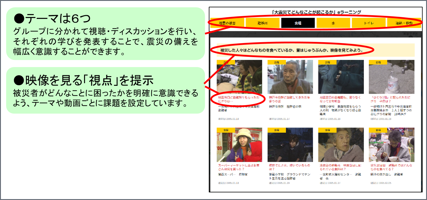 京都大学防災研究所との共同研究をもとに、「都市型震災のリアル」がわかる動画を抽出。児童・生徒同士のディスカッションを促し、「今できること」を強く意識できるサイトに。