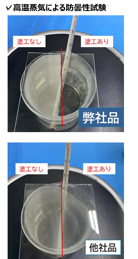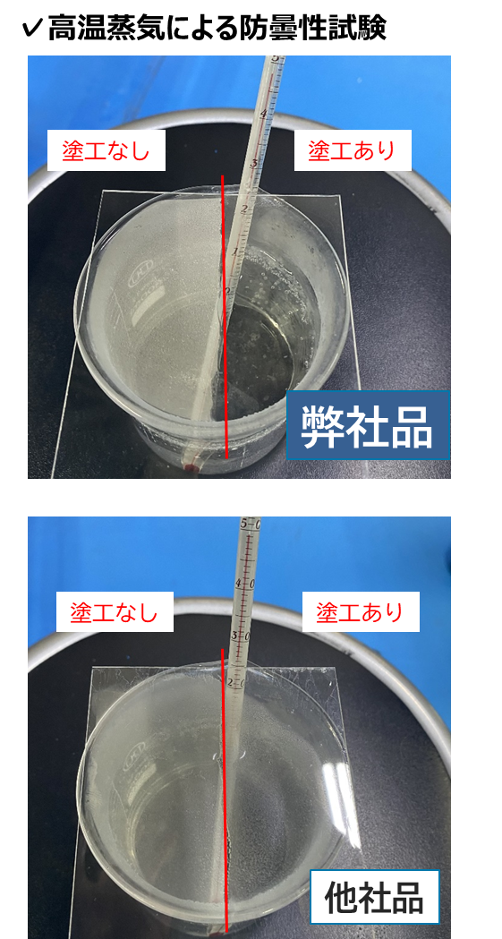 弊社が新規開発した本コーティング剤は、人の呼気程度の蒸気に対する防曇性はもちろん、熱湯に近い高温蒸気に晒した過酷な条件でも透明度を維持することができる優れた防曇性を有しております。