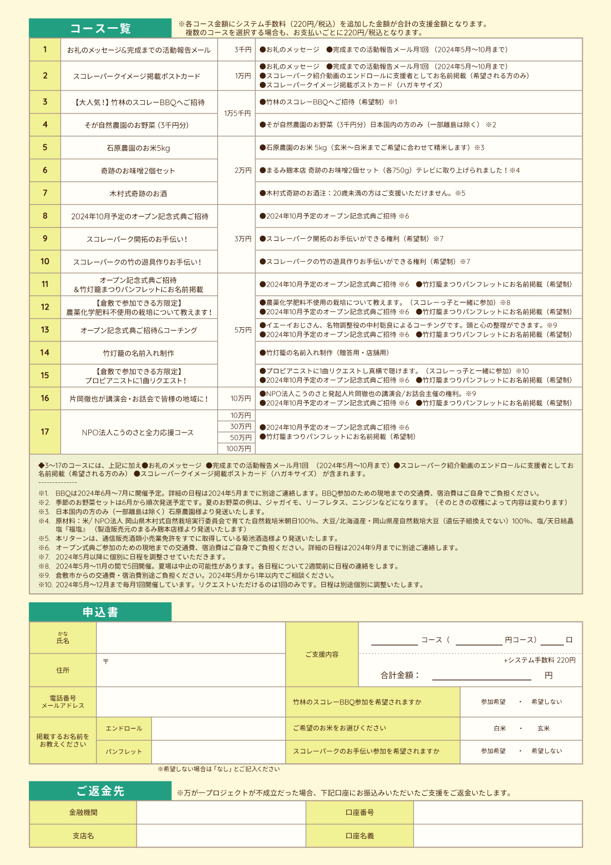 スコレーパークは、通称「スコパ」として、「ゆめぱ」をモデルにし、自然体験が自由にできる公園を目指して参加型でつくっていく。建設費用を調達するため、クラウドファンディングを実施中。クラウドファンディング期間は、令和6年3月18日(月)12時 〜 4月30日(火)23時の43日間。4月5日に第一目標金額となる300万円を達成し、ネクストゴール450万円に向けて挑戦中。