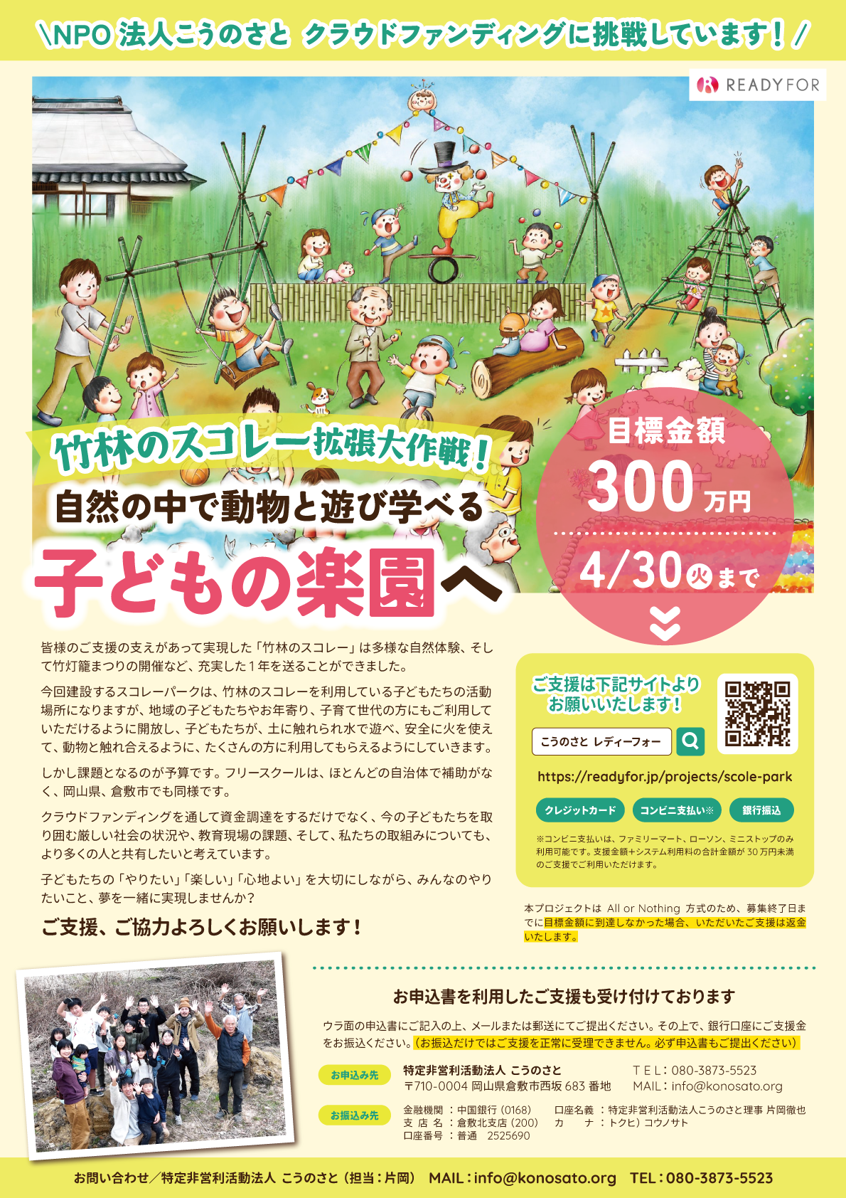 上映会を主催するNPO法人こうのさとは、玉島陶で運営している自然の中で生きる力を育むオルタナティブスクール「竹林のスコレー」の拡張を計画している。およそ3,000m2の耕作放棄地を開墾して子どもたちが土や水、動物に触れられて命のぬくもりを感じられる場所としてスコレーパークの建設を目指している。
