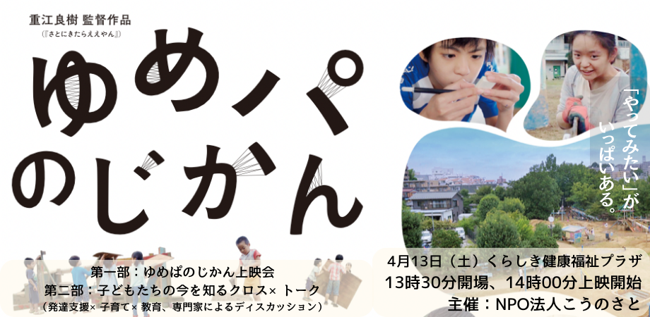4月13日(土)倉敷市 ゆめぱのじかん上映会、子どもたちの今を知るクロス×トーク開催のお知らせ - NPO法人こうのさと 子どもの楽園をつくるためクラウドファンディング挑戦中
